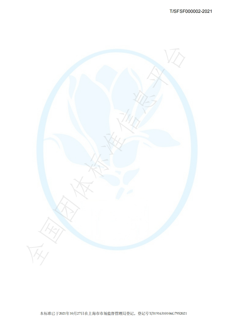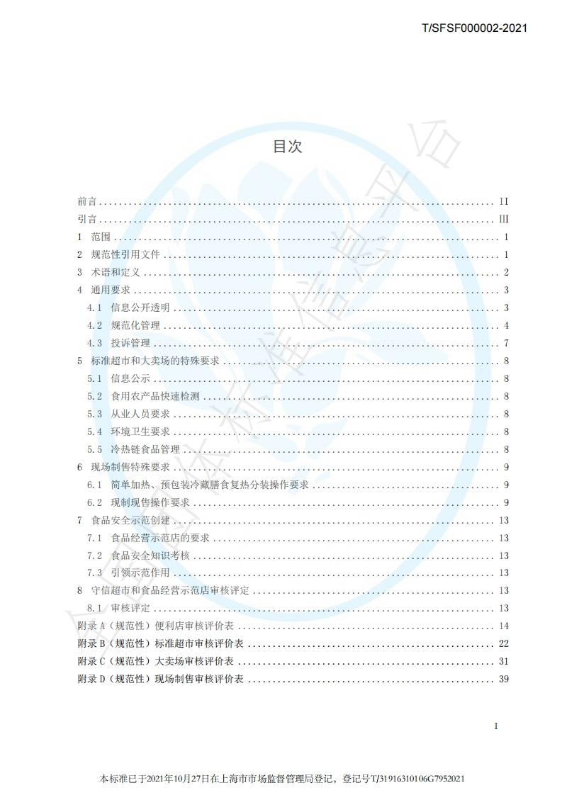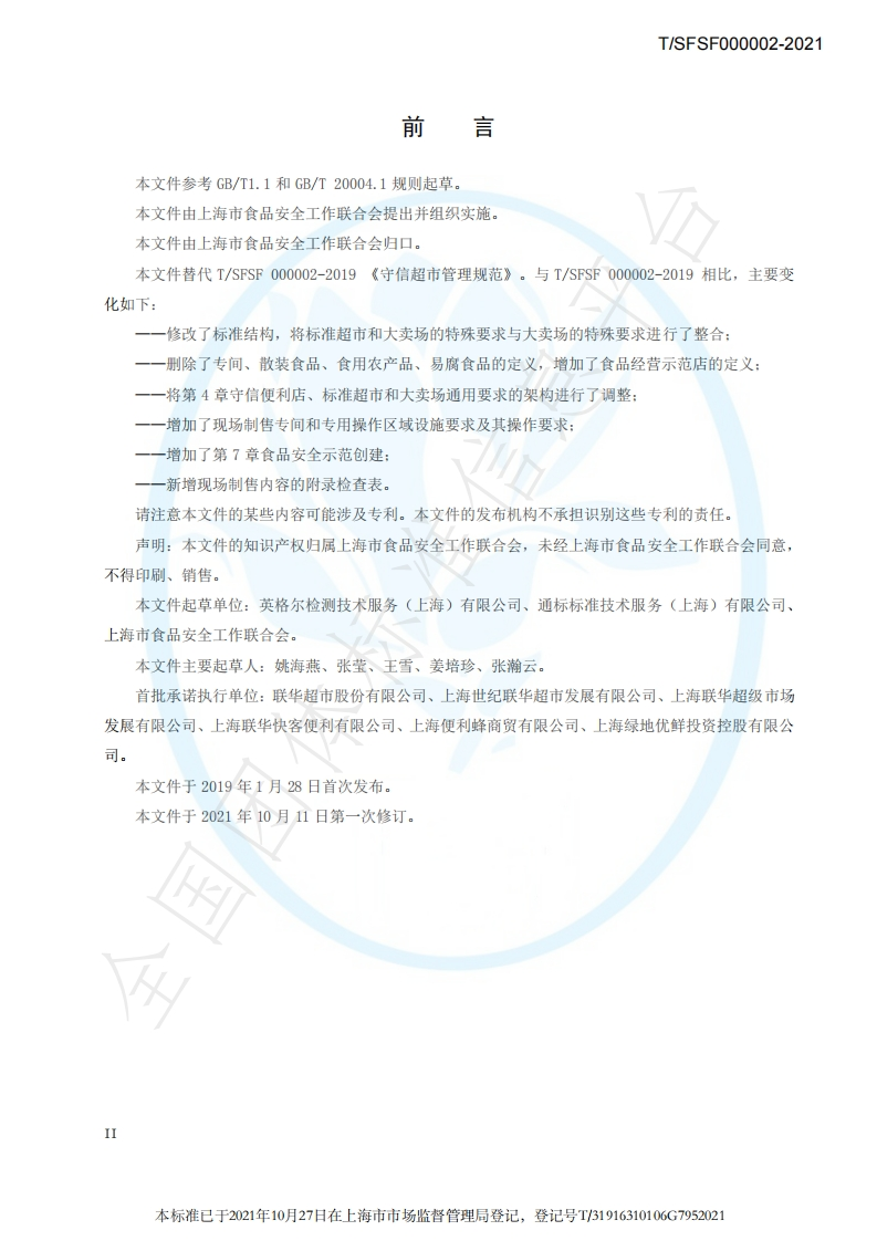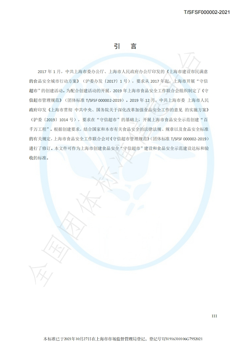 本标准已于2021年10月27日在上海市市场监督管理局登记,登记号T/31916310106G79520211CS号:1C567.040中国标准文献分类号:X00团体标准T/SFSF000002-2021代替T/SFSF000002-2019守信超市管理规范The Standard of trustworthy supermarket management2021-10-11发布2021-12-11实施上海市食品安全工作联合会发布2110181213410g