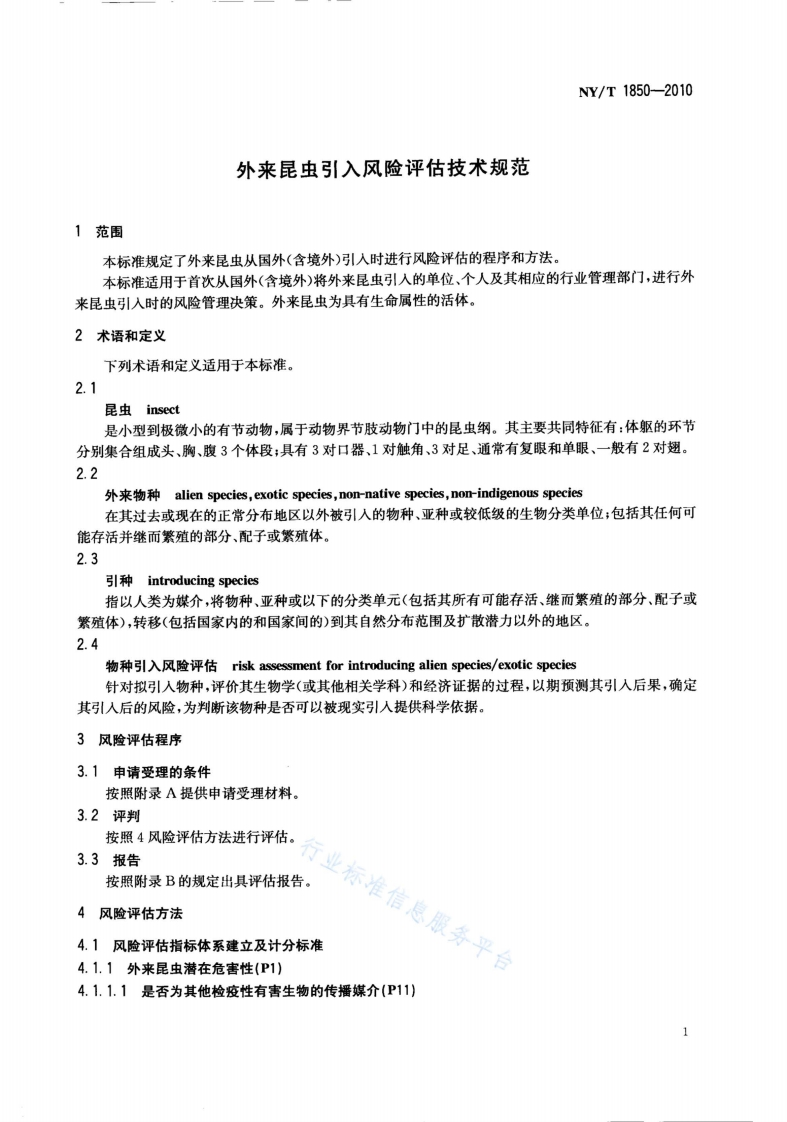 外来昆虫引入风险评估技术规范348072@abc3个月前发布关注私信1.95MB8页030外来昆虫引入风险评估技术规范此内容为付费资源,请付费后查看¥13¥19黄金会员免费钻石会员免费立即购买您当前未登录!建议登陆后购买,可保存购买订单付费资源 第1页 / 共8页 第2页 / 共8页 第3页 / 共8页 第4页 / 共8页 第5页 / 共8页 试读已结束,还剩3页,您可下载完整版后进行离线阅读 THE END标准规范 文本预览 ICS65.020B16NY中华人民共和国农业行业标准NY/T1850-2010外来昆虫引入风险评估技术规范Rules for risk assessment of introducing alien insect行业标准信息服务平台2010-05-20发布2010-09-01实施中华人民共和国农业部发布 查看更多 收起部分 喜欢就支持一下吧收藏