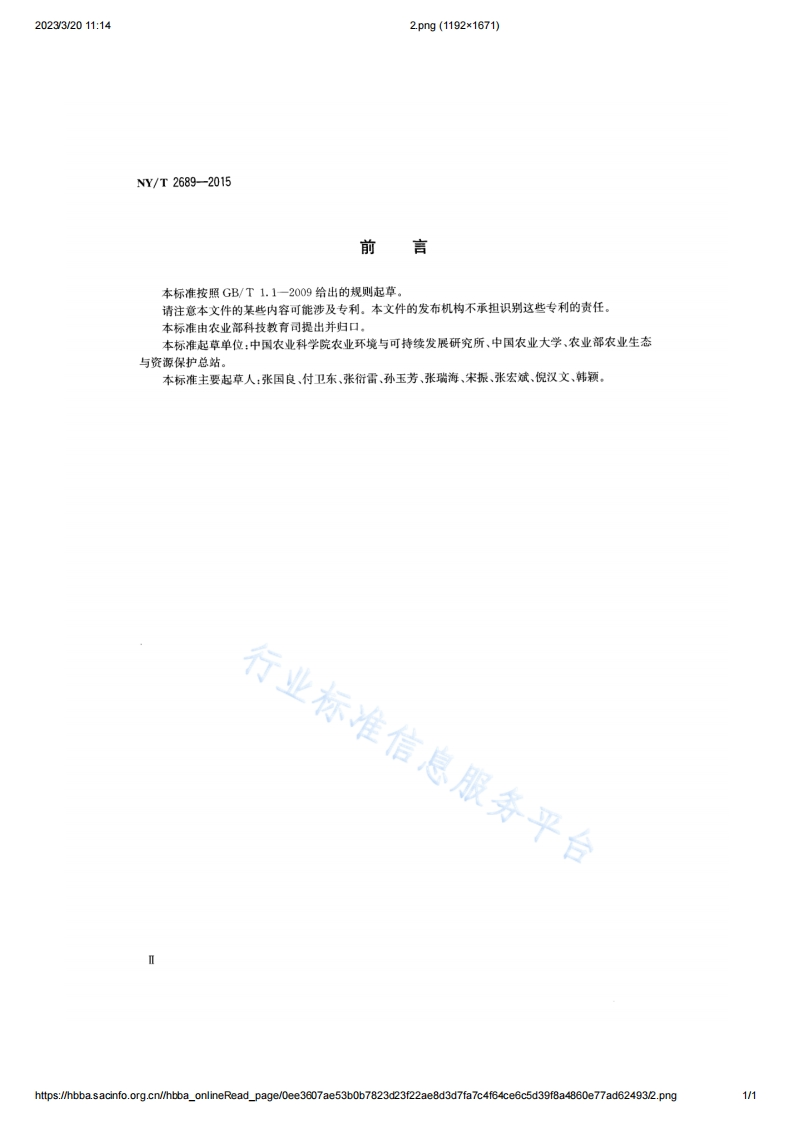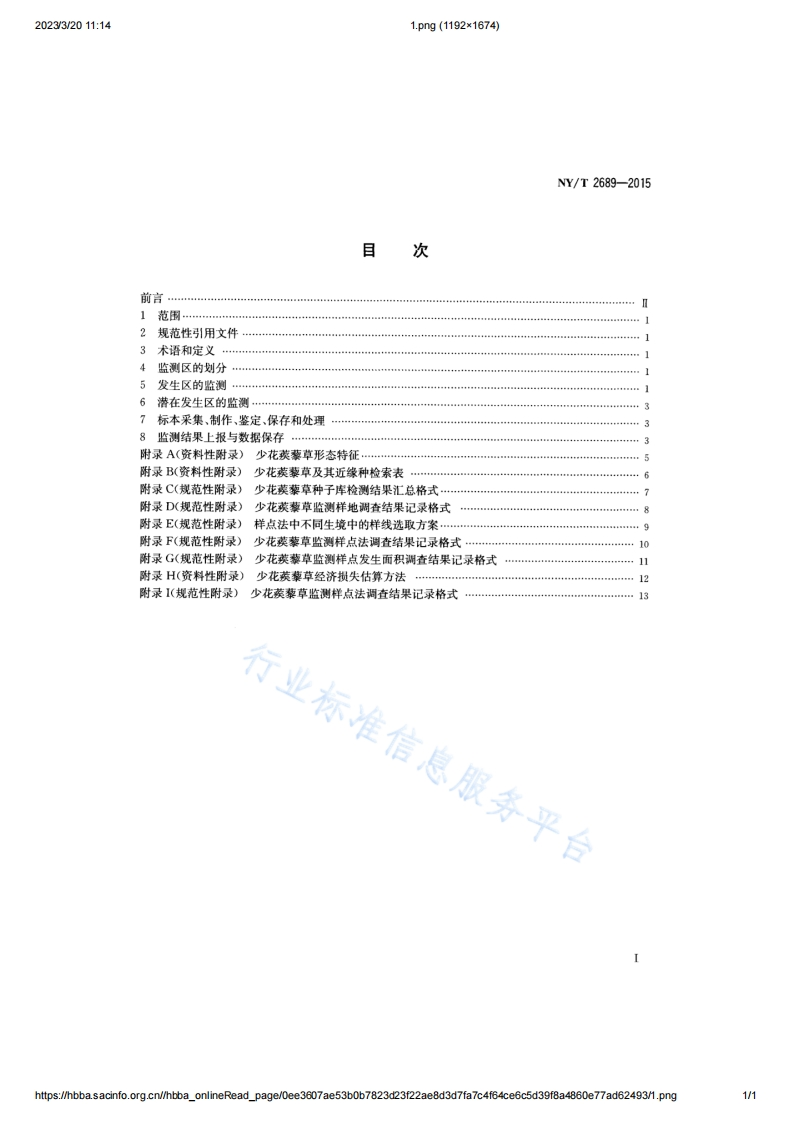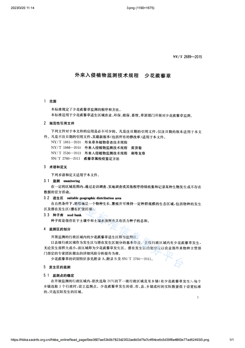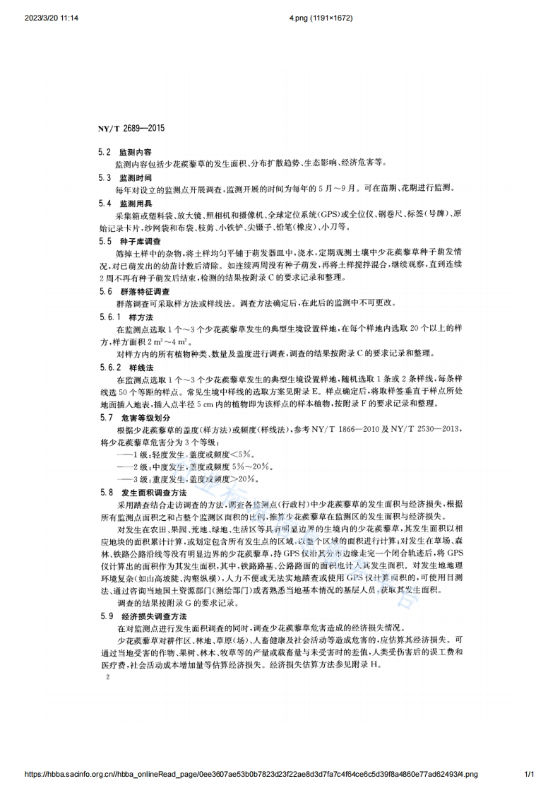 2023/3/2011:140.png(1193×1673)ICs65.020B16NY中华人民共和国农业行业标准NY/T2689-2015外来入侵植物监测技术规程少花蒺藜草Codes of practice for monitoring alien species-Cenchrus pauciflorus Benth.行业标准信息服务平台2015-02-09发布2015-05-01实施中华人民共和国农业部发布https://hbba.sacinfo.org.cn//hbba_onlineRead_page/0ee3607ae53b0b7823d23f22ae8d3d7fa7c4f64ce6c5d39f8a4860e77ad62493/0.png