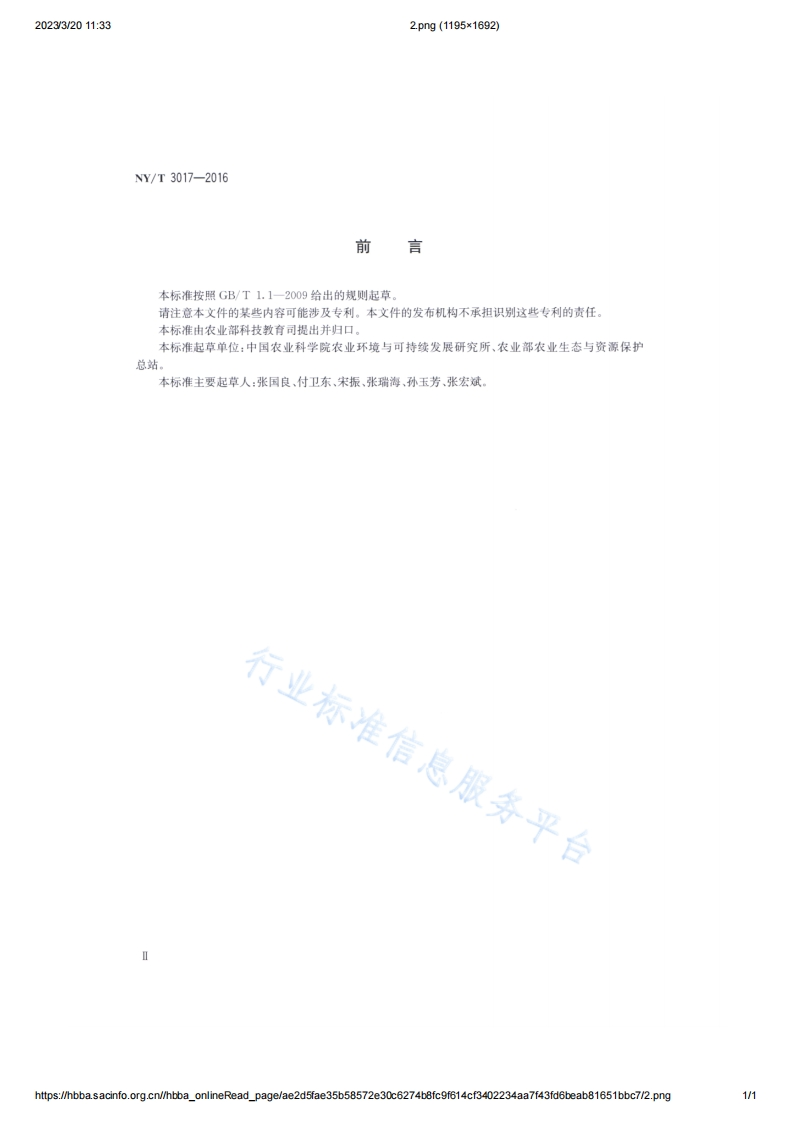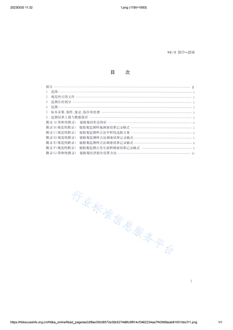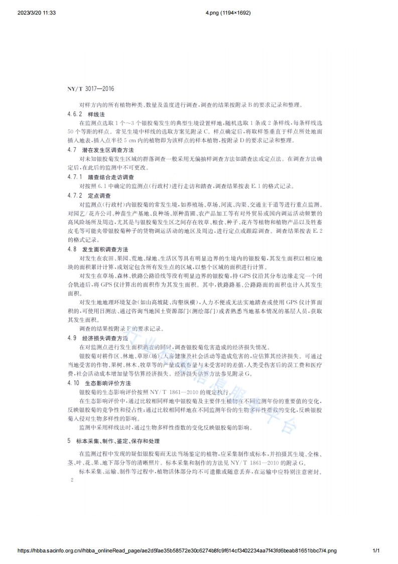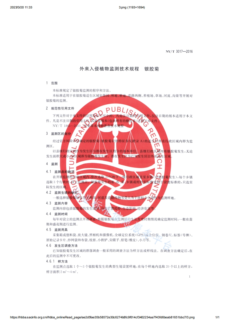 2023/3/2011:320.png(1197×1693)ICs65.020B16NY中华人民共和国农业行业标准NY/T3017-2016外来入侵植物监测技术规程银胶菊Code of practice for monitoring alien species-Parthenium hysterophorus L.行业标准信息服务平台2016-11-01发布2017-04-01实施中华人民共和国农业部发布https://hbba.sacinfo.org.cn//hbba_onlineRead_page/ae2d5fae35b58572e30c6274b8fc9f614cf3402234aa7f43fd6beab81651bbc7/0.png
