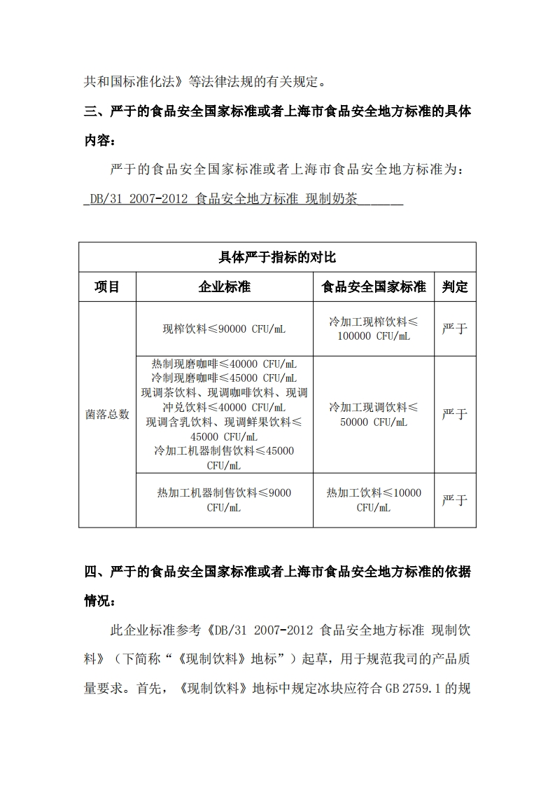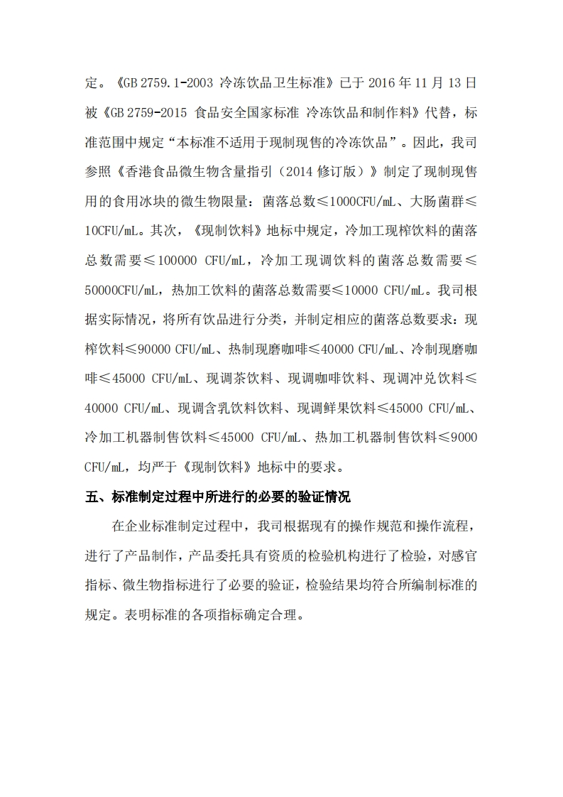 沪上阿姨企业标准《现制饮料》编制说明一、任务来源、食品性能特性、企业标准起草过程等有关情况本公司根据市场需求和监管需要,制定此标准。由于本产品的标准严于食品安全地方标准,为贯彻《中华人民共和国食品安全法》和《中华人民共和国标准化法》等法律法规的要求,本公司特制定本企业标准Q/SAYI0001S-2022《现制饮料》作为门店制作、销售出产品的质量依据。二、企业标准编制原则。与现行的法律、法规、规章和食品安全国家标准、地方标准的关系及贯彻执行情况本标准的编制本着真实性、可行性、合法性等原则。真实性:本标准中所述原辅料、工艺流程均按照本公司实际情况编写,同时提供的相关证件的复印件等资料均为真实可信,不掺假,不隐瞒。可行性:企业根据经评审后修订的标准样稿,将样品送交检验机构检测,各项指标均高于或等于标准样稿拟定的数值,也验证了产品各项指标的合理性。合法性:本标准的编写格式符合GB/T20001.10-2014《标准编写规则第10部分产品标准》且企业产品所使用的原辅料用料均是通过正规渠道合法采购,符合《中华人民共和国食品安全法》的相关规定。本标准贯彻执行了《中华人民共和国食品安全法》、《中华人民