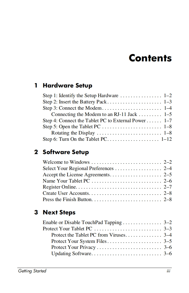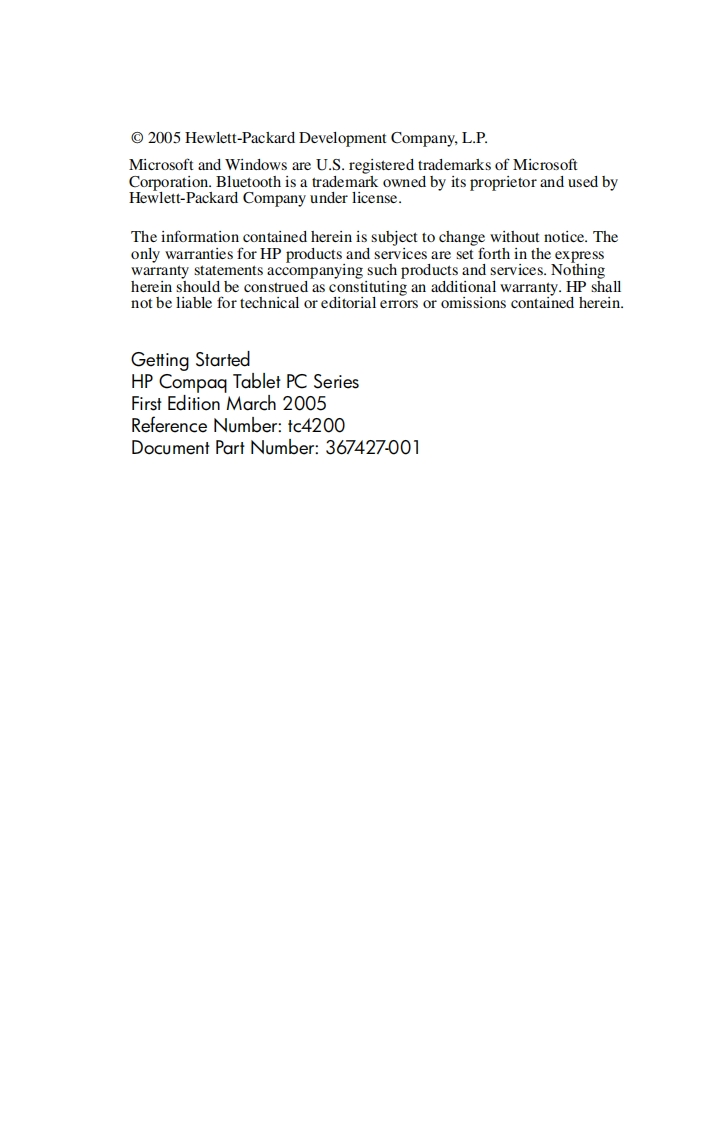 i n ve n fGetting StartedHP Compaq Tablet PC SeriesDocument Part Number:367427-001March 2005This guide explains how to set up your hardware and softwareand begin using your tablet PC.Enhanced for Accessibility.