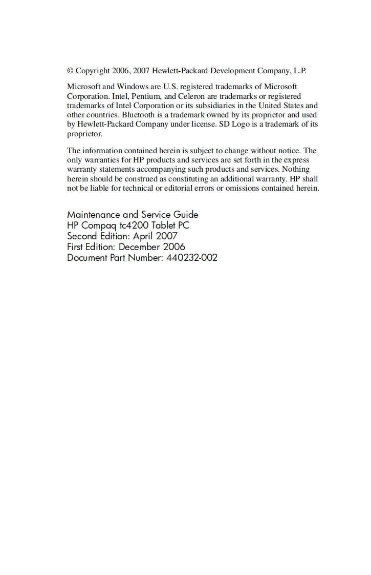 i n v e n tMaintenance and ServiceGuideHP Compaq tc4200 Tablet PCDocument Part Number:440232-002April 2007This guide is a troubleshooting reference used for maintainingand servicing the tablet PC.It provides comprehensiveinformation on identifying tablet PC features,components,andspare parts;troubleshooting tablet PC problems;and performingtablet PC disassembly procedures.