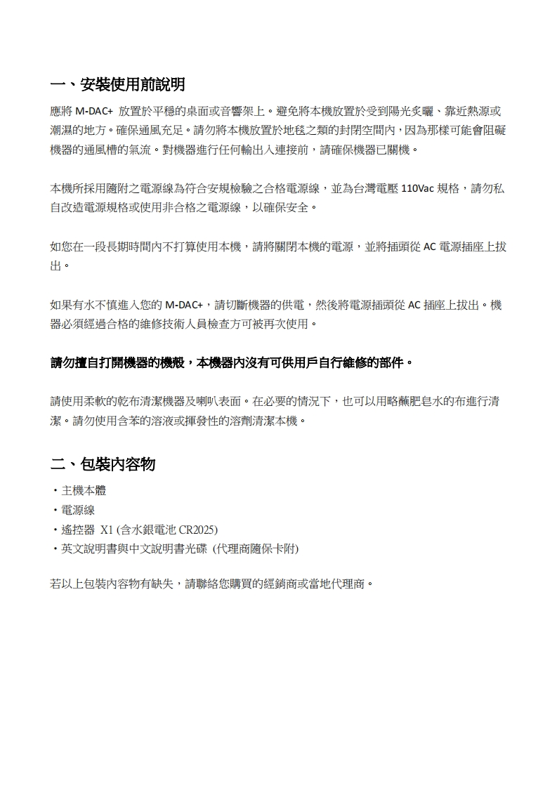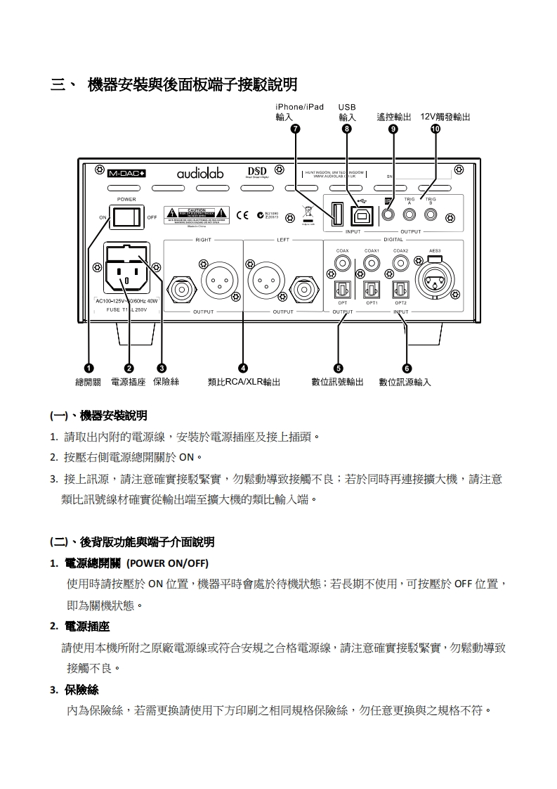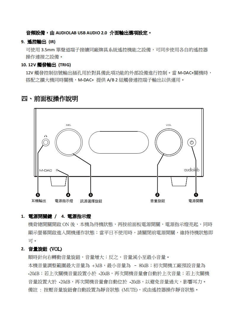 M-DAC-中文说明书手册348072@abc3个月前发布关注私信1.34MB13页045M-DAC-中文说明书手册此内容为付费资源,请付费后查看¥13¥19黄金会员免费钻石会员免费立即购买您当前未登录!建议登陆后购买,可保存购买订单付费资源 第1页 / 共13页 第2页 / 共13页 第3页 / 共13页 第4页 / 共13页 第5页 / 共13页 试读已结束,还剩8页,您可下载完整版后进行离线阅读 THE END说明书手册 文本预览 audiolabM-DAC+DA轉換器(兼容耳擴/數位前級)COAX2 MuteDSD己与@e384u⅓2:USB DACBALAMCED12V TRIGiPhone☐iPad中文使用說明書 查看更多 收起部分 喜欢就支持一下吧收藏