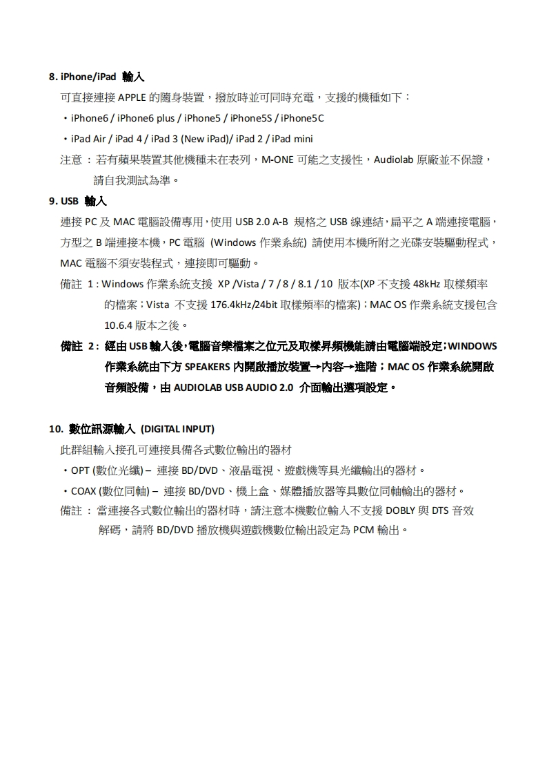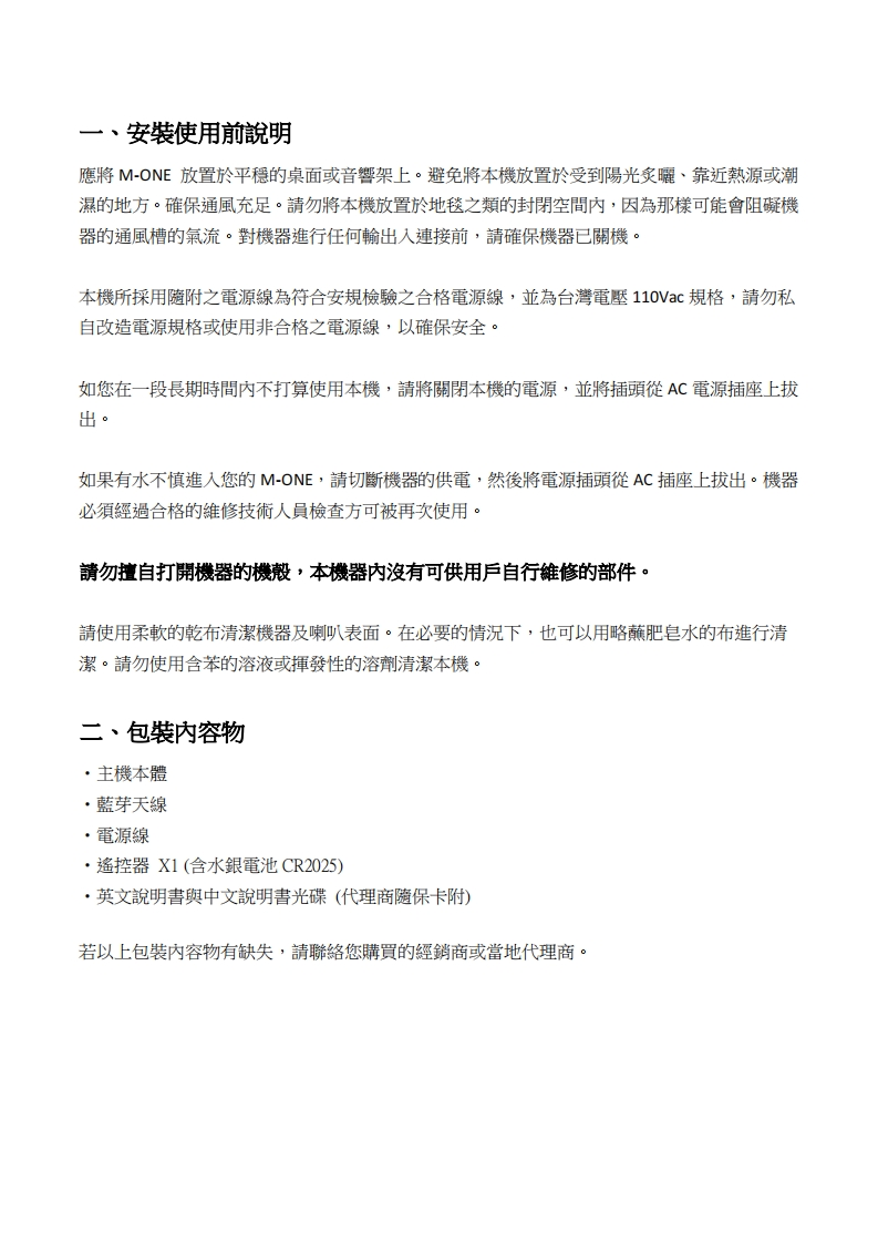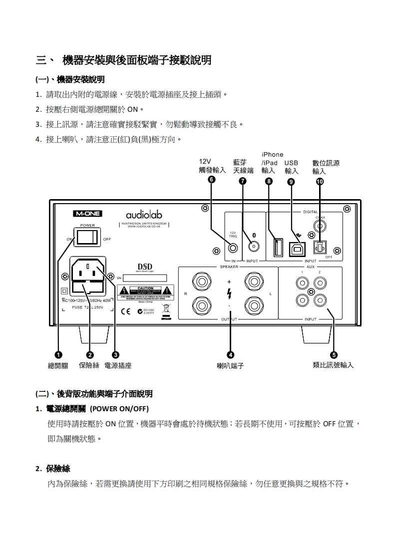 M-ONE-中文说明书手册348072@abc3个月前发布关注私信1.35MB13页040M-ONE-中文说明书手册此内容为付费资源,请付费后查看¥13¥19黄金会员免费钻石会员免费立即购买您当前未登录!建议登陆后购买,可保存购买订单付费资源 第1页 / 共13页 第2页 / 共13页 第3页 / 共13页 第4页 / 共13页 第5页 / 共13页 试读已结束,还剩8页,您可下载完整版后进行离线阅读 THE END说明书手册 文本预览 audiolabM-ONE藍芽粽合壙大機(兼容USB DAC/耳擴)BT-20dBPairingM-ONEaudiolabBluetoothapt☒DSD38432tUSB DAC12V TRIGiPhone☐iPad中文使用說明書 查看更多 收起部分 喜欢就支持一下吧收藏
