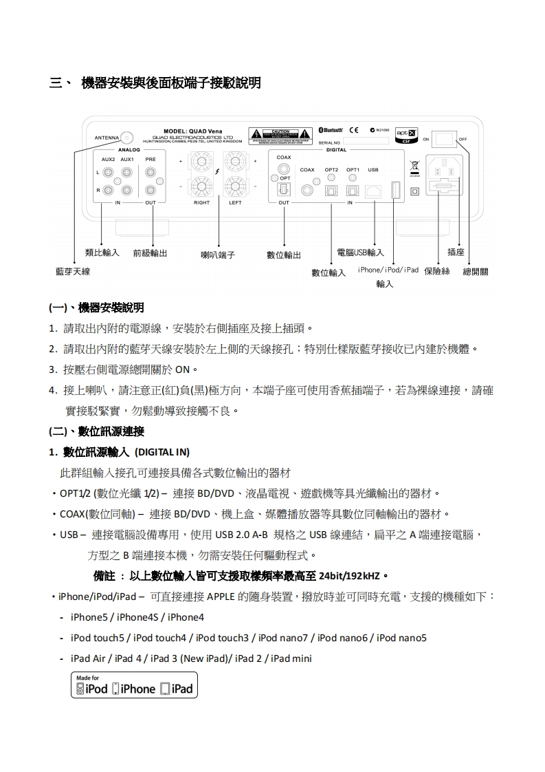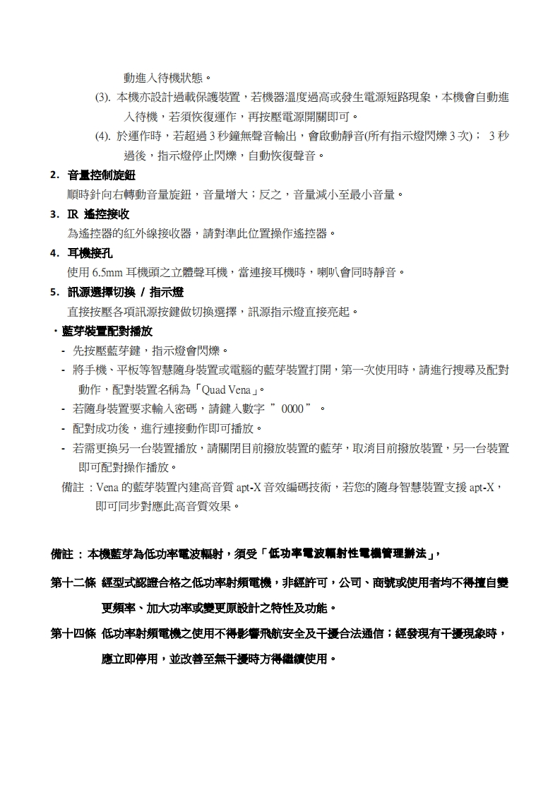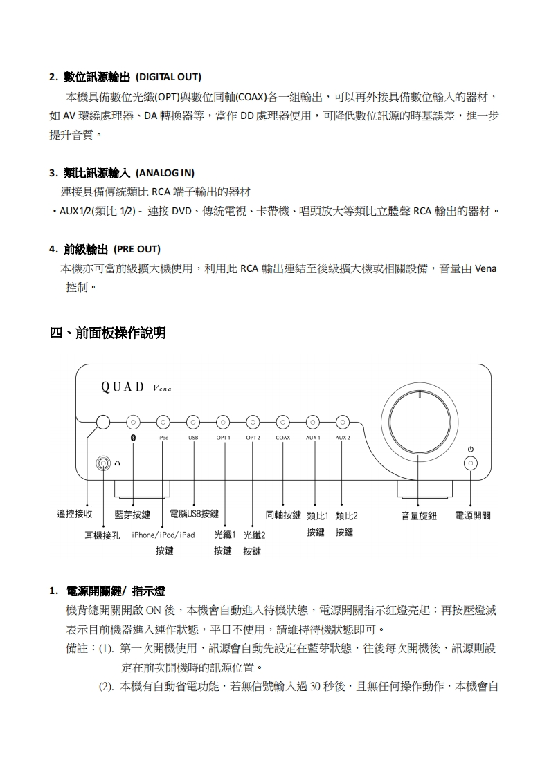 Quad-Vena-中文说明书手册348072@abc3个月前发布关注私信0.95MB8页032Quad-Vena-中文说明书手册此内容为付费资源,请付费后查看¥13¥19黄金会员免费钻石会员免费立即购买您当前未登录!建议登陆后购买,可保存购买订单付费资源 第1页 / 共8页 第2页 / 共8页 第3页 / 共8页 第4页 / 共8页 第5页 / 共8页 试读已结束,还剩3页,您可下载完整版后进行离线阅读 THE END说明书手册 文本预览 QUADthe closest approach to the original soundVena綜合擴大機QUADQUAD V.。⊙⊙⊙⊙-⊙⊙⊙⊙Bluetoothapt☒Made for遏iPod iPhone☐iPad中文使用說明書 查看更多 收起部分 喜欢就支持一下吧收藏