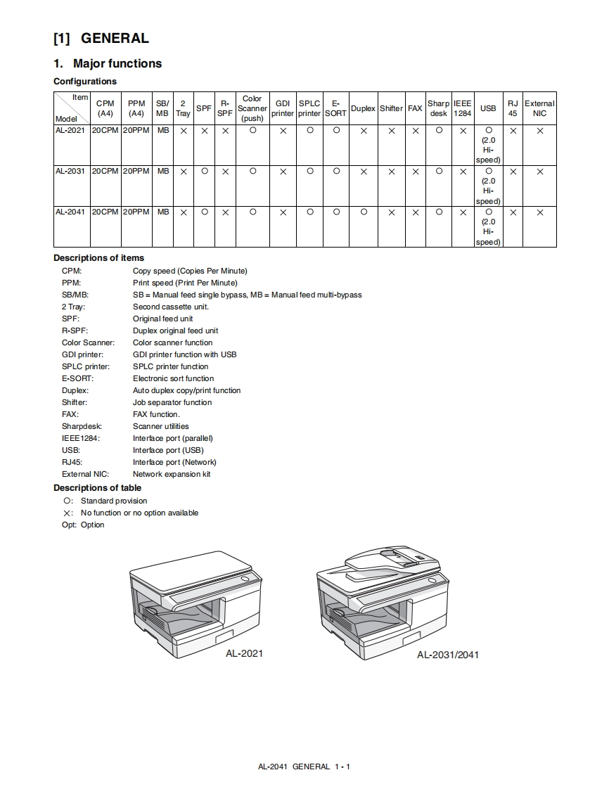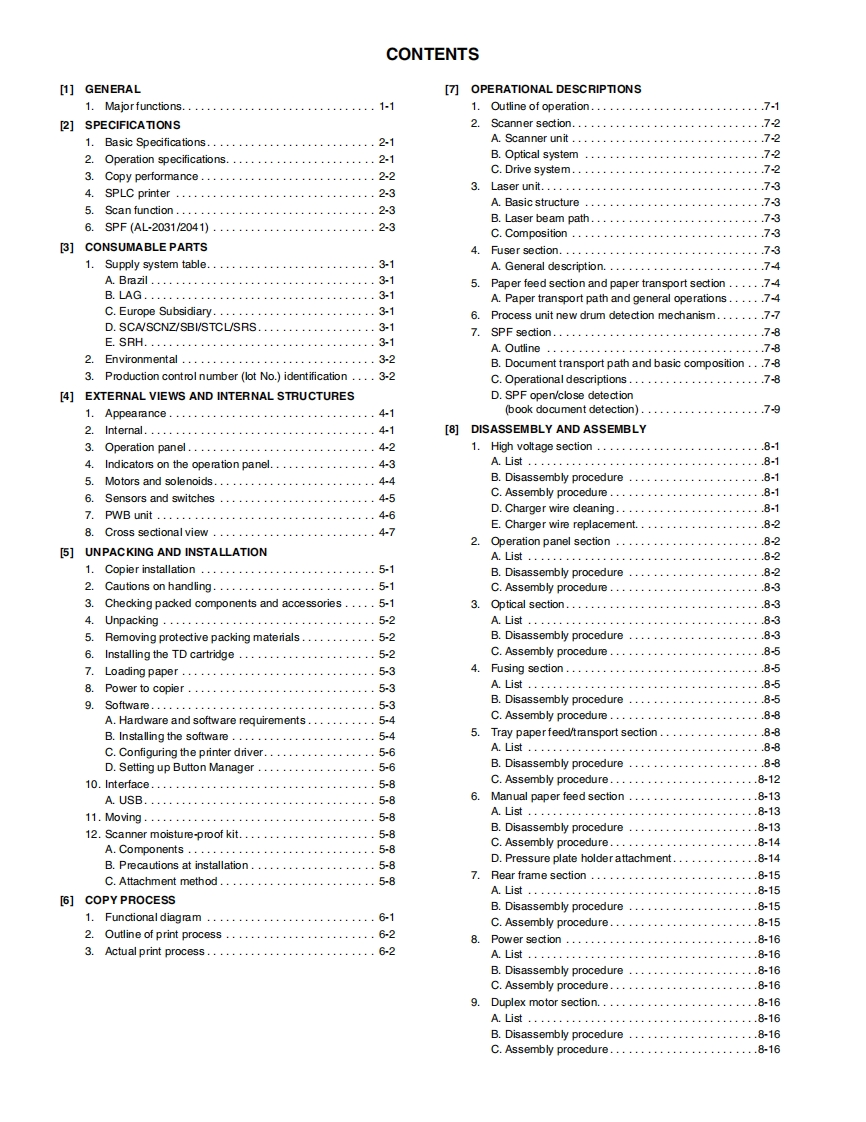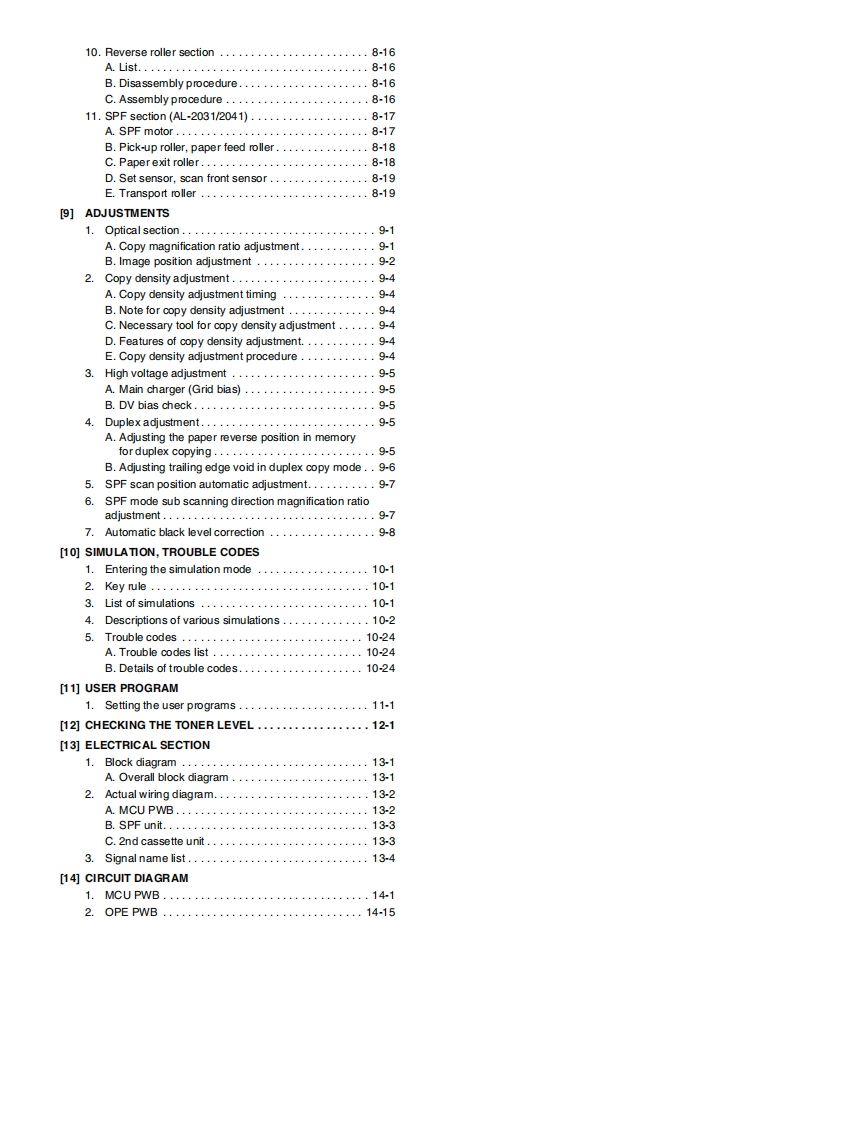 SHARPSERVICE MANUALCODE:00ZAL2041/S2EDIGITAL MULTIFUNC-TIONAL SYSTEMAL-2021AL-2021AL-2031MODEL AL-2041AL-2031AL-2041CONTENTS[1]GENERAL.................[2]SPECIFICATIONS.....................................2-1[3]CONSUMABLE PARTS................3-1[4]EXTERNAL VIEWS AND INTERNAL STRUCTURES.........4-1[5]UNPACKING AND INSTALLATION.....….5-1[6]COPY PROCESS...............6-1[7]OPERATIONAL DESCRIPTIONS...…….7-1[8]DISASSEMBLY AND ASSEMBLY...[9]ADJUSTMENTS...............9-1[10]SIMULATION,TROUBLE CODES...10-1[11]USER PROGRAM...............11-1[12]CHECKING THE TONER LEVEL....................12-1[13]ELECTRICAL SECTION......................13-1[14]CIRCUIT DIAGRAM................14-1Parts marked with"A"are important for maintaining the safety of the set.Be sure to replace these parts withspecified ones for maintaining the safety and performance of the set.This document has been published to be usedSHARP CORPORATIONfor after sales service only.The contents are subject to change without notice.