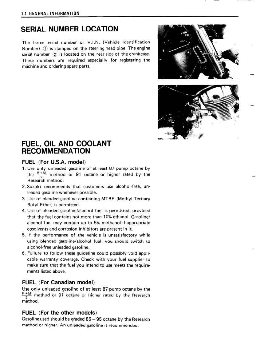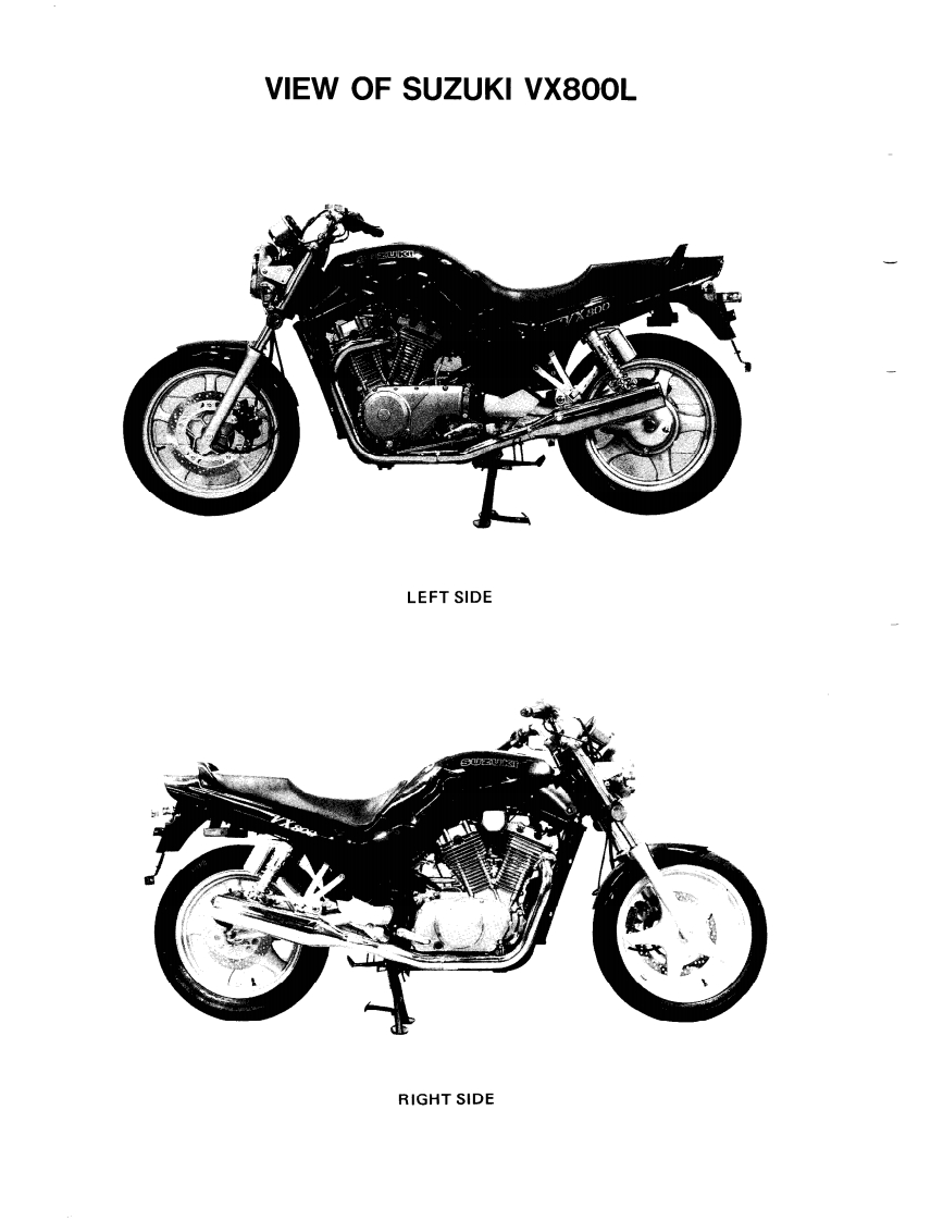 FOREWORDGROUP INDEXThe SUZUKI VX800 has been developed as a newgeneration motorcycle.It is packed with highlyadvanced design concepts including a V-2 engine,GENERAL INFORMATIONa liquid cooling system,a new highly efficient1combustion system (TSCC),a fully transistorizedignition system and a shaft drive mechanism.PERIODIC MAINTENANCE ANDCombined with precise control and easy handlingTUNE-UP PROCEDURESthe VX800 provides excellent performance andoutstanding riding comfort.This service manual has been produced primarilyENGINE3for experienced mechanics whose job is to in-spect,adjust,repair and service SUZUKI motor-cycles.Apprentice mechanics and do-ti-yourselfmechanics,will also find this manual an extremelySHAFT DRIVE4useful repair guide.This manual contains the mostup-to-date information at the time of publication.The rights are reserved to update or make correc-COOLING SYSTEM5tions to this manual at any time.FUEL AND LUBRICATIONIMPORTANTSYSTEMAll street-legal SUZUKI motorcycles with enginedisplacement of 50cc or greater are subject toELECTRICAL SYSTEMEnvironmental Protection Agency emission regula-tions.These regulations set specific standards forexhaust emission output levels as well as particularservicing requirements.This manual includesCHASSISspecific information required to properly inspectand service VX800 in accordance with all EPAregulations.It is strongly recommended that thechapter on Emission Control,Periodic ServicingSERVICING INFORMATIONand Carburetion be thoroughly reviewed beforeany type of service work is performed.EMISSION CONTROL10Further information concerning the EPA emissionINFORMATIONregulations and U.S.SUZUKI's emission controlprogram can be found in the U.S.SUZUKI EMIS-SION CONTROL PROGRAM MANUAL/SER-VX800M (91-MODEL)11VICE BULLETIN.VX800N (92-MODEL)12SUZUKI MOTOR CORPORATIONMotorcycle TechnicalService DepartmentVX800P ('93-MODEL)13COPYRIGHT SUZUKI MOTOR CORPORATION 1990