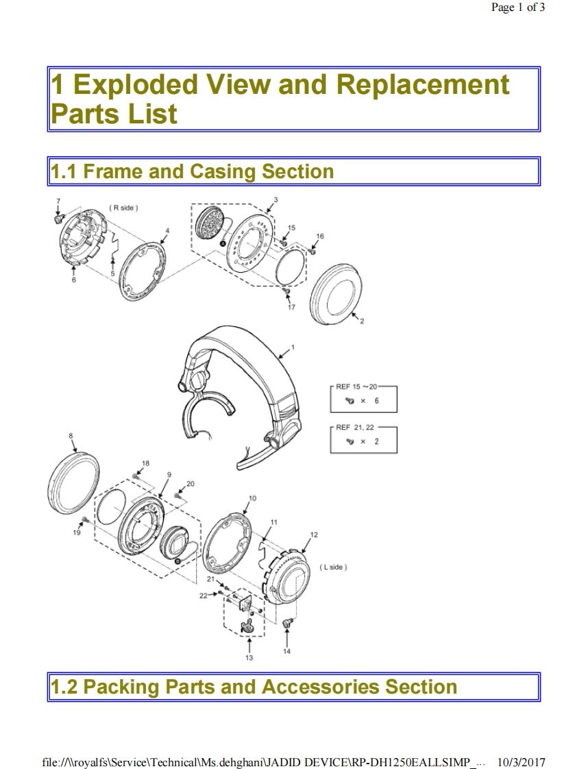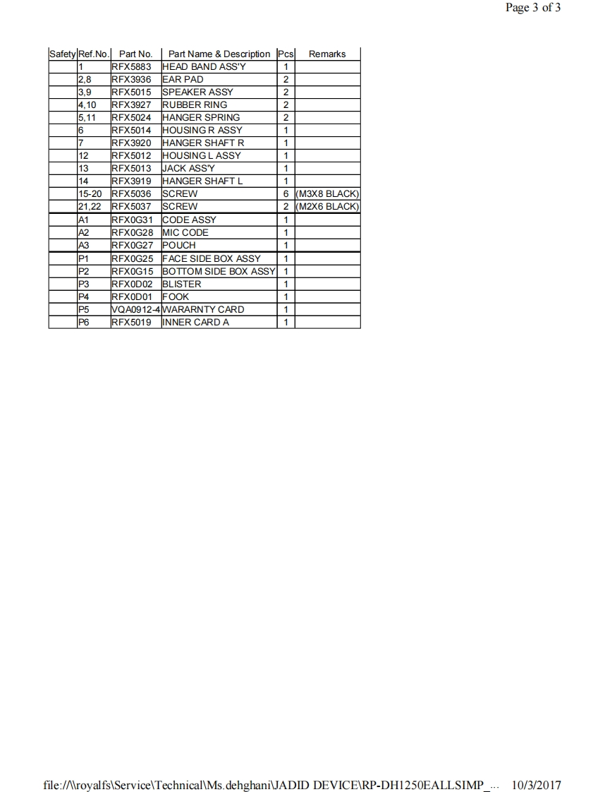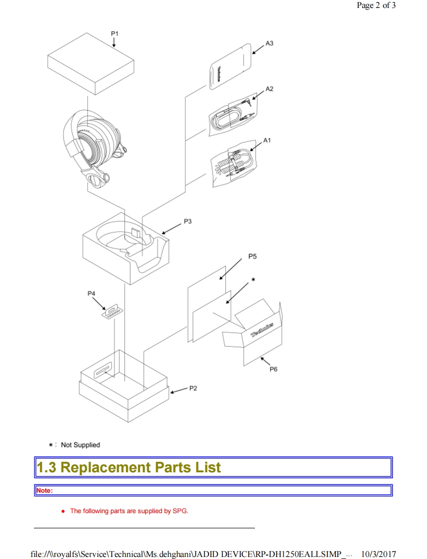 Page 1 of2PanasonicOrder No.AD1307007AEJ1Service ManuaStereo HeadphonesModel No.RP-DH1250EColour(S)............Silver TypeSimplifiedMade foriPod口iPhonePlease file and use this manual together with the service manual for Model No.RP-DH1200E,Order No.AD0404040C8.SpecificationType:Dynamic Closed-typeDriver units:50mm(1 15/16in.)diameterImpedance:500Sensitivity:107dB/mWPower handling capacity:3.500mW(*IEC)Frequency response:5Hz-30.000HzCord:Cord with Remote Mic:1.2mCoil Cord 1.2-3mPlug:Stereo mini-plug [3.5mm(1 /8in.)diameter].L-type,gold-platedMass:360 g(without cord)Accessories:Plug adapter(6.3mm)Carrying pouchIEC:International Electrotechnical CommissionDesign and specifications subject to change without notice.file:/AroyalfsServiceTechnicalMs.dehghaniJADID DEVICERP-DH1250EALLSIMP ..10/3/2017