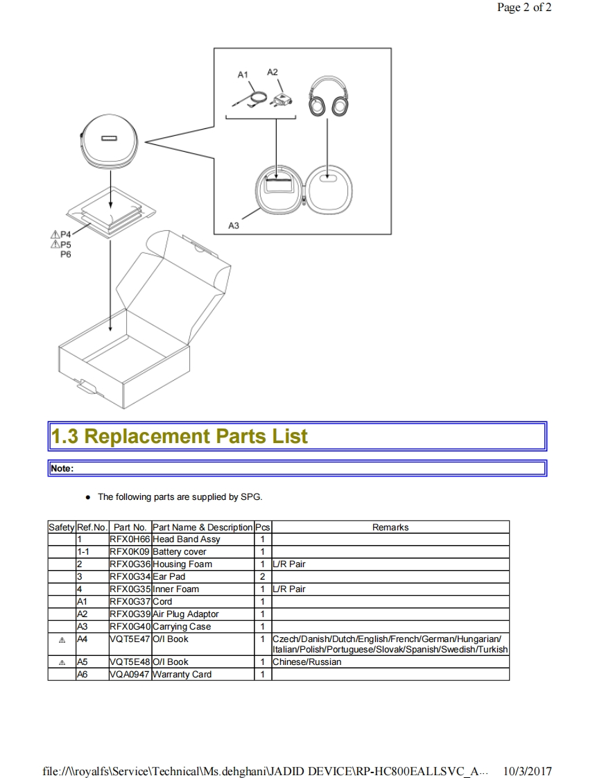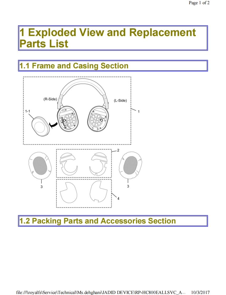 Page 1 of 1PanasonicORDER NO.AD1406007CEService ManualStereo HeadphonesModel No.RP-HC800EColour(K)..........BIack TypeSpecificationsDriver units:40 mm (Neodymium)Impedance:19 Q(500 Hz.NC ON)17 Q(500 Hz.NC OFF)Sensitivity:94 dB/mW (NC ON).92 dB/mW(NC OFF)Power handling capacity50 mW(IEC)Frequency response:10 Hz to 25.000 HzLevel of noise canceling:22 dB(Approx.100 Hz)Power requirement:DC 1.5V(R03/LR03.AAA)Battery life:Approx.16 hours(R03)Approx.40 hours(LR03)Cord length:Approx.1.5 mPlug:3.5 mm (1/8 in.)stereo mini plug(L type,24K gold plated)Mass (Weight):Approx.247 g(without battery and cord)Operating temperature range:0℃to40℃Operating humidity range:35%RH to 80%RH(no condensation)IEC:International Electrotechnical CommissionNOTE:The actual life of the battery depends onoperating conditions.Specifications are subject to change without notice.AWARNINGThis service information is designed for experienced repair technicians only and is not designed for use by the general public.It does not contain wamings or cautions to advise non-technical individuals of potential dangers in attempting to service a product.Products powered by electricity should be serviced or repaired only by experienced professional technicians.Any attempt to serviceor repair the product or products dealt with in this service information by anyone else could result in serious injury or death.Panasonic Corporation 2014 Unauthorized copying and distribution is a violation of law.file:/AlroyalfsServiceTechnicalMs.dehghaniJADID DEVICERP-HC800EALLSVC A...10/3/2017