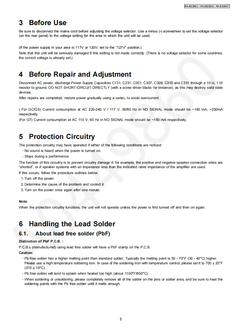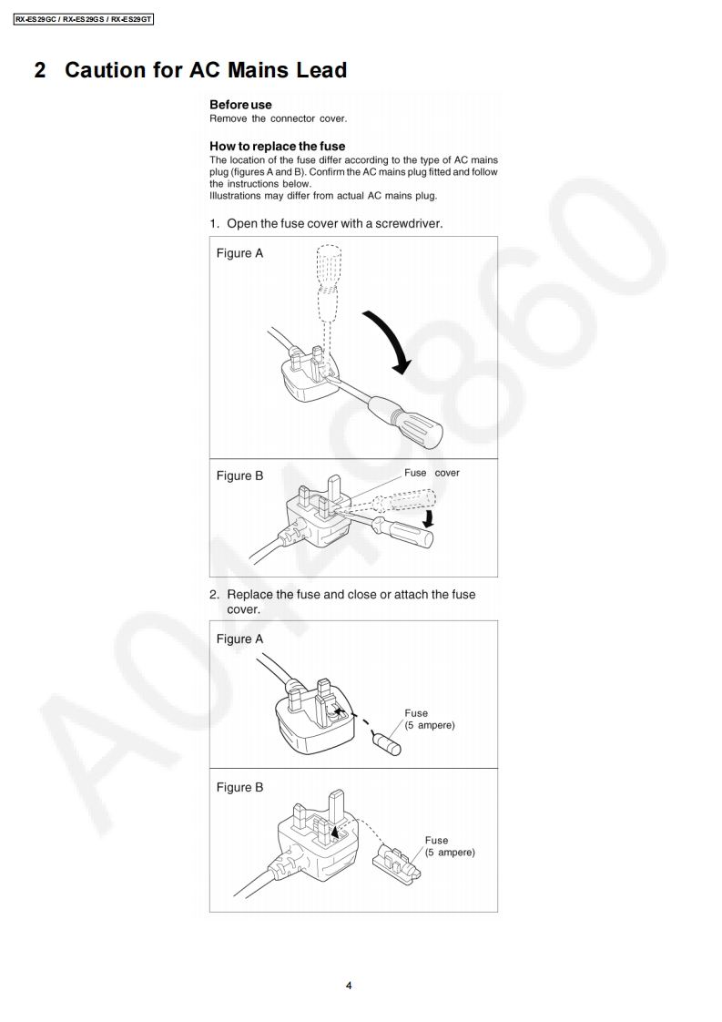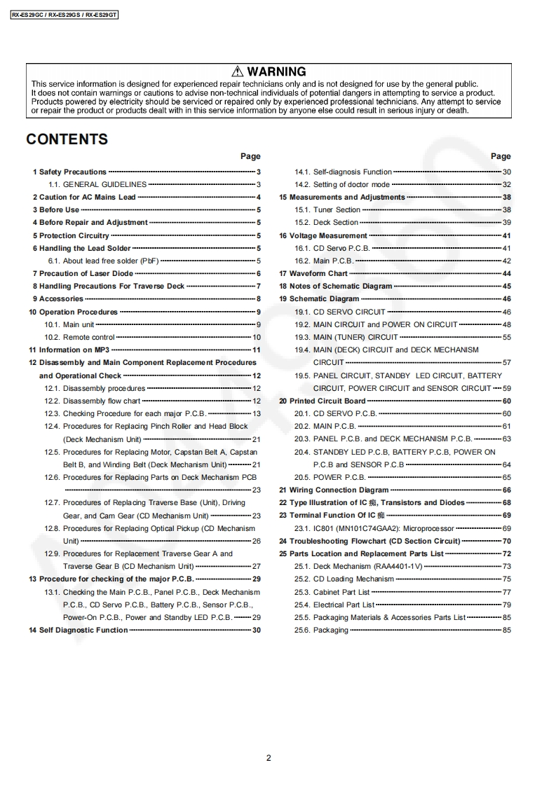 Order No.MD0503060C3Service ManualPortable Stereo CD Systemd5前RX-ES29GCDIGITAL AUDIORX-ES29GSRX-ES29GTColour(S)..........Silver TypeSpecificationn RADIOJacksFrequency rangeOutputPhones:3.5 mm stereo (16-320)FM87.50-108.00 MHz (50 kHz steps)Power requirement (For GC/GS)AM522-1629 kHz (9 kHz steps)AC110-127V1220-240V,50/60Hz520-1630 kHz(10 kHz steps)Power consumption33WPower requirement (For GT)nCD PLAYERAC110V,60HzSampling frequency44.1 kHzPower consumption32WDecoding16 bit linearBattery12 V [Eight R20/LR20 (D,UM-1)Beam sourceSemiconductor laser (wavelengthbatteries]780nm)1 Do not use rechargeable type batteriesNo.of channels2 channel,stereoMemory backup for6 V [Four R6/LR6 (AA.UM-3)Wow and flutterBelow measurable limitcomputer/clockbatteries]D/A converterMASH (1 bit DAC)I Do not use rechargeable type batteriesDimensions529mm0W0x144mm(hx276n TAPE RECORDERmm(D)】Mass (For GC/GS)Track systemStereo4.4 kg without batteriesMass (For GT)4.2 kg without batteriesMonitor systemVariable sound monitorPower consumption in standby3.0W(1170Recording systemAC biasmode (For GC/GS)3.5W2400Erasing systemMulti Pole magnetPower consumption in standby2.7WFrequency rangemode (For GT)Normal position50-14000HzNotes:n GENERAL1.Specifications are subject to change without noticeSpeakers8cm5.42x22.Mass and dimensions are approximate.2005 Matsushita Electric Industrial Co.Ltd..AllPanasonicrights reserved.Unauthorizedcopyinganddistribution is a violation of law.