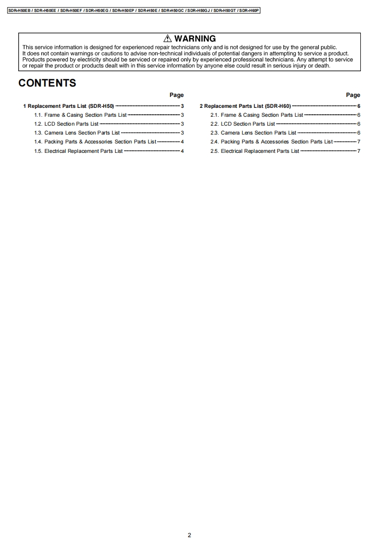 ORDER NO.VM0804027AE27Service ManualSD Card Hard Disk Video CameraModoI No.SDR-H50EBSimplifiedSDR-H50EESDR-H50EFSDR-H50EGSDR-H50EPSDR-H50ESDR-H50GCSDR-H50GJSDR-H50GTSDR-H60PSDR-H60PCSDR-H6OPLSDR-H60EBSDR-H60EESDR-H60EFSDR-H60EGSDR-H60EPSDR-H60ESDR-H60GCSDR-H60GJSDR-H60GNSDR-H68GKVOL.1Colour(S).Silver TypePlease use this manual together with the service manual for Model No.SDR-H40,Order No.VM0712053CE.2008 Matsushita Electric Industrial Co.,Ltd.AllPanasonicrights reserved.Unauthorized copyinganddistribution is a violation of law.