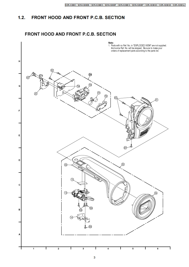 ORDER NO.VM0801005AEService ManualSD Card Hard Disk Video CameraModoINo SDR-H280ESimplifiedSDR-H280EBSDR-H280EESDR-H280EFSDR-H280EGSDR-H280EPSDR-H280GCSDR-H280GDSDR-H280GJPbFSDR-H280GNSolder Lead freeSDR-H280GTSDR-H288GKVOL.1Colour(S)..Silver TypePlease use this manual together with the service manual for Model No.SDR-H250EG-S,OrderNo.VM0703036CE.WARNINGThis service information is designed for experienced repair technicians only and is not designed for use by the general public.It does not contain warnings or cautions to advise non-technical individuals of potential dangers in attempting to service a product.Products powered by electricity should be serviced or repaired only by experienced professional technicians.Any attempt to serviceor repair the product or products dealt with in this service information by anyone else could result in serious injury or death.CONTENTSPagePage1 Exploded View-.21.4.CCD AND LENS SECTION---51.1.MAIN PARTS SECTION-21.5.PACKING PARTS AND ACCESSORIES SECTION---61.2.FRONT HOOD AND FRONT P.C.B.SECTION.---2 REPLACEMENT PARTS LIST--71.3.SIDE R OPERATION AND LCD SECTION..-----2.1.REPLACEMENT NOTES-Panasonic2008 Matsushita Electric Industrial Co.,Ltd.Allrightsreserved.Unauthorizedcopyinganddistribution is a violation of law.