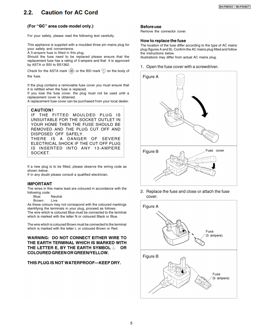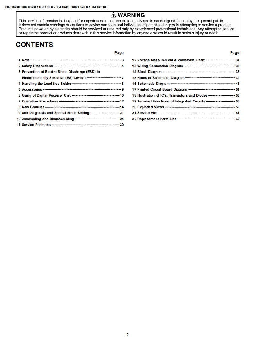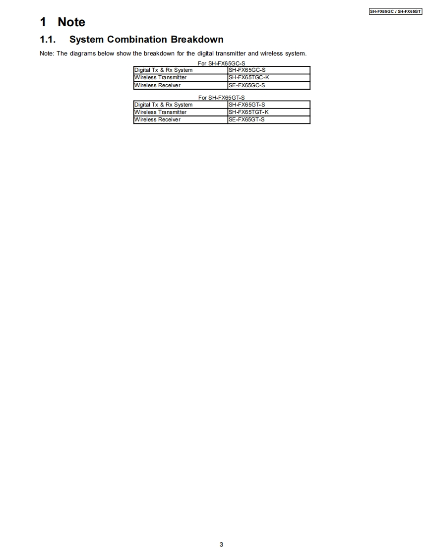 ORDER NO.MD0705015CEService ManualWireless System and Digital TransmitterSH-FX65GCP过mtSH-FX65GTSE-FX65GCSH-FX65TGC/GTSE-FX65GC/GTSE-FX65GTSH-FX65TGCSH-FX65TGTColour(S)..........Silver Type(K).........Black Type (Only for SH-FX65TGC/GT)Specification■RF SECTIONSE-FX6543WWireless moduleDimensions (W x H x D)Frequency range2.400to2.4835GHzSH-FX65T65 mm x 52 mm x 8.6 mmNumber of channelsSE-FX65165 mm x 90 mm x 164 mmMass■AMPLIFIER SECTIONSH-FX65T0.02kgOutput powerSE-FX650.655kgRMS output powerOperating temperature range+5Cto+35℃Surround Ch125 W per channel (3Q),1 kHz,10Operating humidity range5%to 90 RH (no condensation)THDPower consumption in off modeapprox.0.3 WTotal RMS power250WDIN output powerNotes:Surround Ch70 W per channel (30),1 kHz,11.Specifications are subject to change without noticeTHDMass and dimensions are approximateTotal DIN power140W2.Total hamonic distortion is measured by a digital spectrumanalyzer■GENERALPower supply:Power supplyAC110to240V,50/60HzThis model uses Switching Mode Power Supply (SMPS)Module forPower consumptionpowering the receiver unit.It is replaceable as an assembly unit.SH-FX65T1.5W2007 Matsushita Electric Industrial Co.Ltd..AllPanasonicrights reserved.Unauthorizedcopying anddistribution is a violation of law.