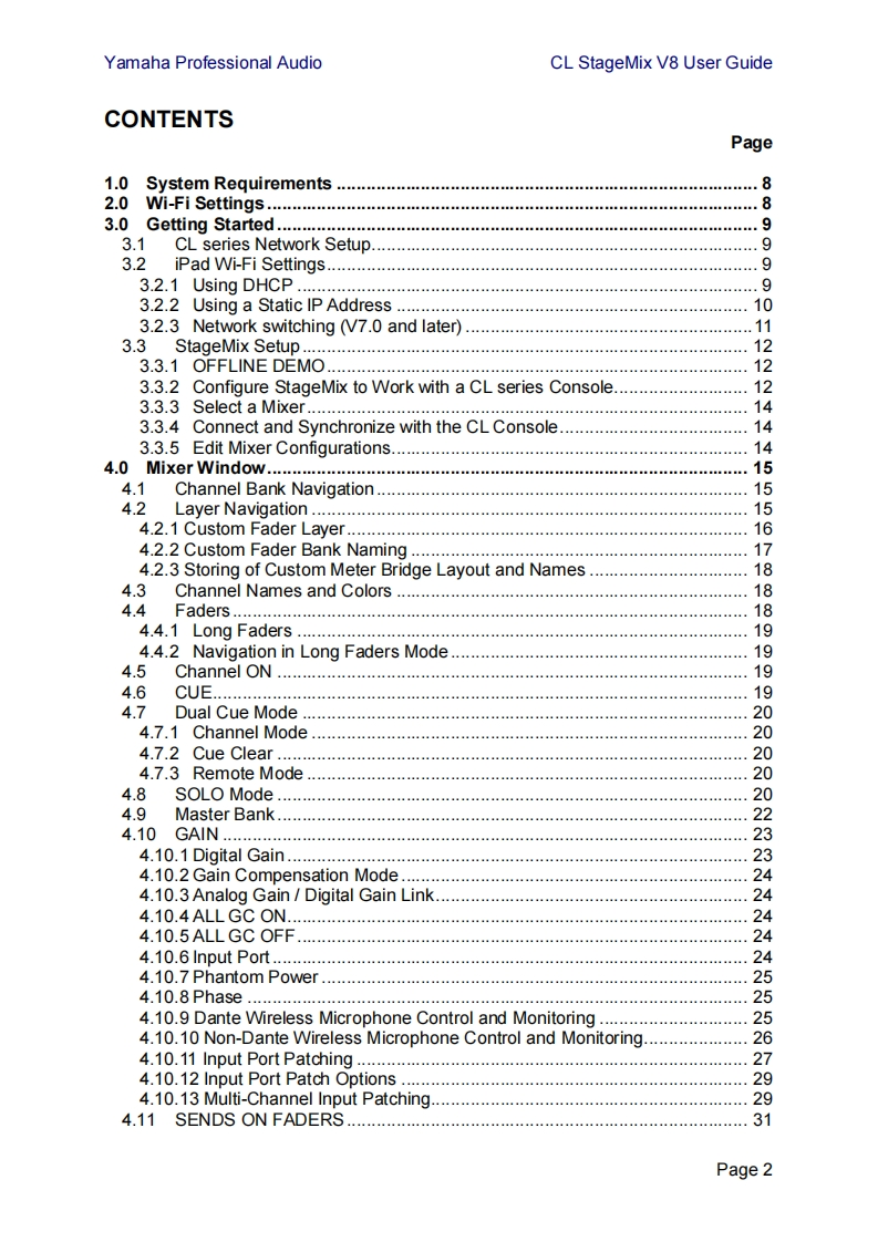 YAMAHADIGITAL MIXING CONSOLESERIESCL StageMix V8 User Guidestagelyix001iP时eaa时omark o碱Apple ineWelcome:Thank you for downloading the "CL StageMix"iPad app for the Yamaha CL seriesdigital mixing consoles.The latest fimmware version for CL series can be downloaded fromhttp://www.yamahaproaudio.com/StageMix is an application for the Apple iPad that provides remote control of YamahaCL series digital mixing console functions via a simple,intuitive graphical interfacefrom anywhere within wireless range.The software has been specifically designed toallow engineers to adjust monitor mixes from the performers'positions on stagedirectly controlling mix parameters via the iPad rather than having to rely on verbaldirections to a second engineer.The result is better mixes in less time;a hugeadvantage during high-pressure pre-show setup.Although StageMix is focused onthe requirements for adjusting monitor mixes on stage,its range of features iscontinually expanding,allowing it to be used for a wider variety of remote controlfunctions.Note:iOS applications may not be supported in your area.Please check with yourYamaha dealer