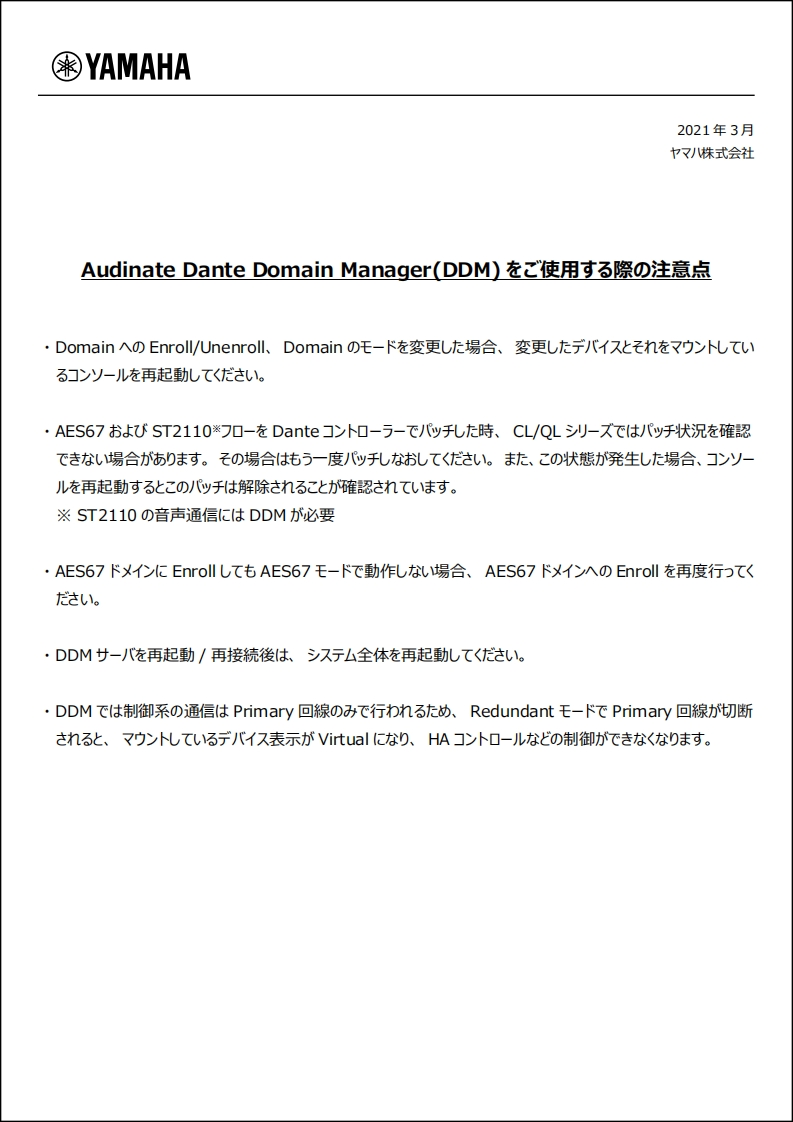 YAMAHAMar.2021Yamaha CorporationNotice about Audinate Dante Domain Manager (DDM)After enrolling or unenrolling a device in a domain,or after changing the domain mode,make sure to restart both the device and the console on which the device is mounted.When an AES67 flow or ST2110*flow is patched using the Dante controller,the patchstatus may not be shown on the CL/QL series.In that case,please make patches again.If this happens,it has also been confirmed that restarting the console will remove thepatches.DDM is required for ST2110 sound communication.If devices do not work as the AES67 mode even if they are enrolled in an AES67 domain,re-enroll the devices to the AES67 domain.After restarting or reconnecting the DDM server,please restart the entire system.DDM uses only the Primary network for the control system communicates.If the Primarynetwork is disconnected in the Redundant mode,the mounted devices are shown asVirtual,and some parameters such as HA control cannot be controlled.