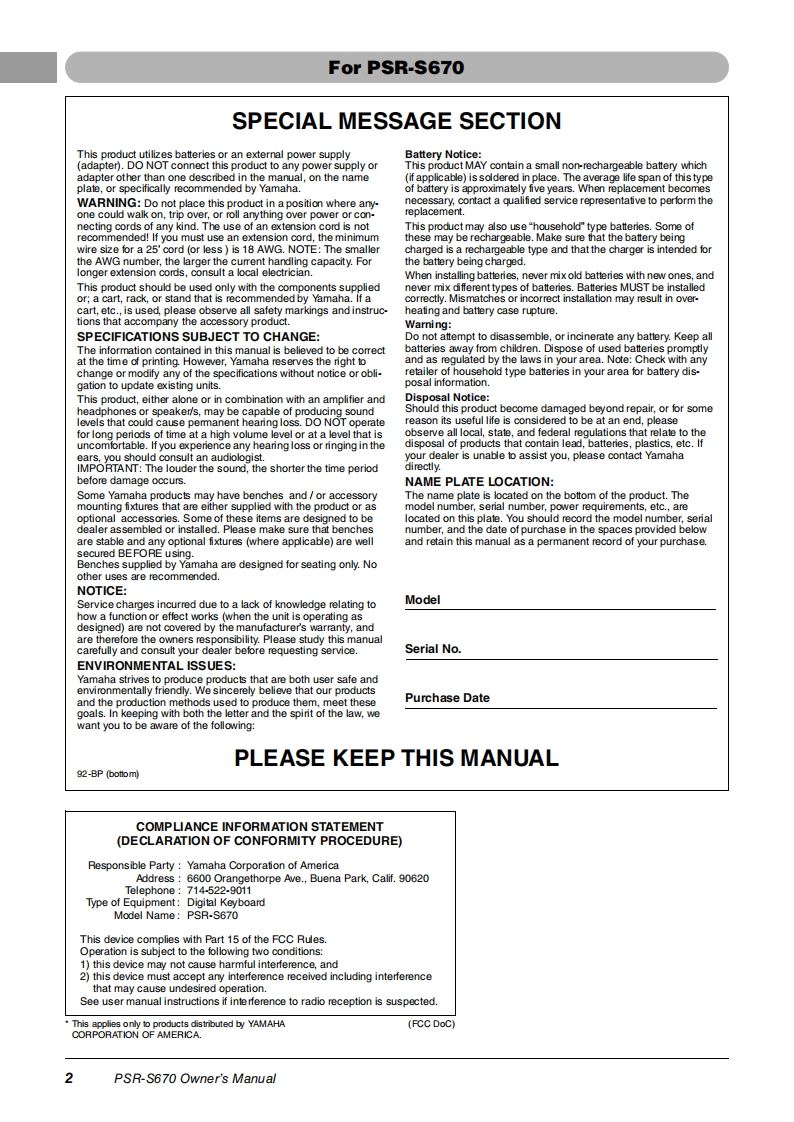 YAMAHAEnglishFrancaisEspanolPR-S☑Digital WorkstationClavier Arrangeur ProfessionnelEstacion de Trabajo DigitalOwner's ManualMode d'emploiManual de instruccionesThank you for purchasing this Yamaha Digital Workstation!We recommend that you read this manual carefully so that you can fully take advantage of theadvanced and convenient functions of the instrument.We also recommend that you keep thismanual in a safe and handy place for future reference.Before using the instrument,be sure to read "PRECAUTIONS"on pages 5-6.Merci d'avoir choisi ce Clavier Arrangeur Professionnel YamahaNous vous conseillons de lire attentivement ce mode d'emploi afin de tirer pleinement profitdes fonctions avancees et tres utiles de votre instrument.Nous vous recommandonsegalement de garder ce manuel a portee de main pour toute reference ulterieure.Avant d'utiliser I'instrument,lisez attentivement la section PRECAUTIONSD'USAGE aux pages 5 et 6.Le damos las gracias por adquirir esta Estacion de Trabajo Digital de Yamaha.La lectura detenida de este manual le permitira disfrutar de las utiles y avanzadasfunciones del instrumento.Recomendamos guardar el manual en un lugar seguro yaccesible,para futuras consultas.ENAntes de utilizar el instrumento,lea las "PRECAUCIONES",en las paginas 5 y 6.FRm时2XGX喔澀ES