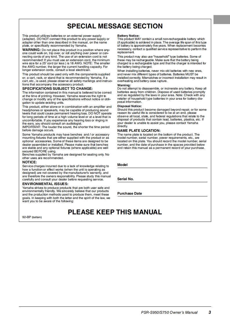 YAMAHAEnglishFrancaisPsR-S马☐PsRS7写Digital WorkstationClavier Arrangeur ProfessionnelOwner's ManualMode d'emploiThank you for purchasing this Yamaha Digital Workstation!We recommend that you read this manual carefully so that you can fully take advantage of the advanced andconvenient functions of the instrument.We also recommend that you keep this manual in a safe and handy place for future reference.Before using the instrument,be sure to read "PRECAUTIONS"on pages 4-5.Merci d'avoir choisi ce Clavier Arrangeur Professionnel YamahaNous vous conseillons de lire attentivement ce mode d'emploi afin de tirer pleinement profit des fonctionsavancees et tres utiles de votre instrument.Nous vous recommandons egalement de garder ce manuel a portee de main pour toute reference ulterieure.Avant d'utiliser l'instrument,lisez attentivement la section PRECAUTIONS D'USAGE aux pages 4 et 5.ENm时2XGXFFR