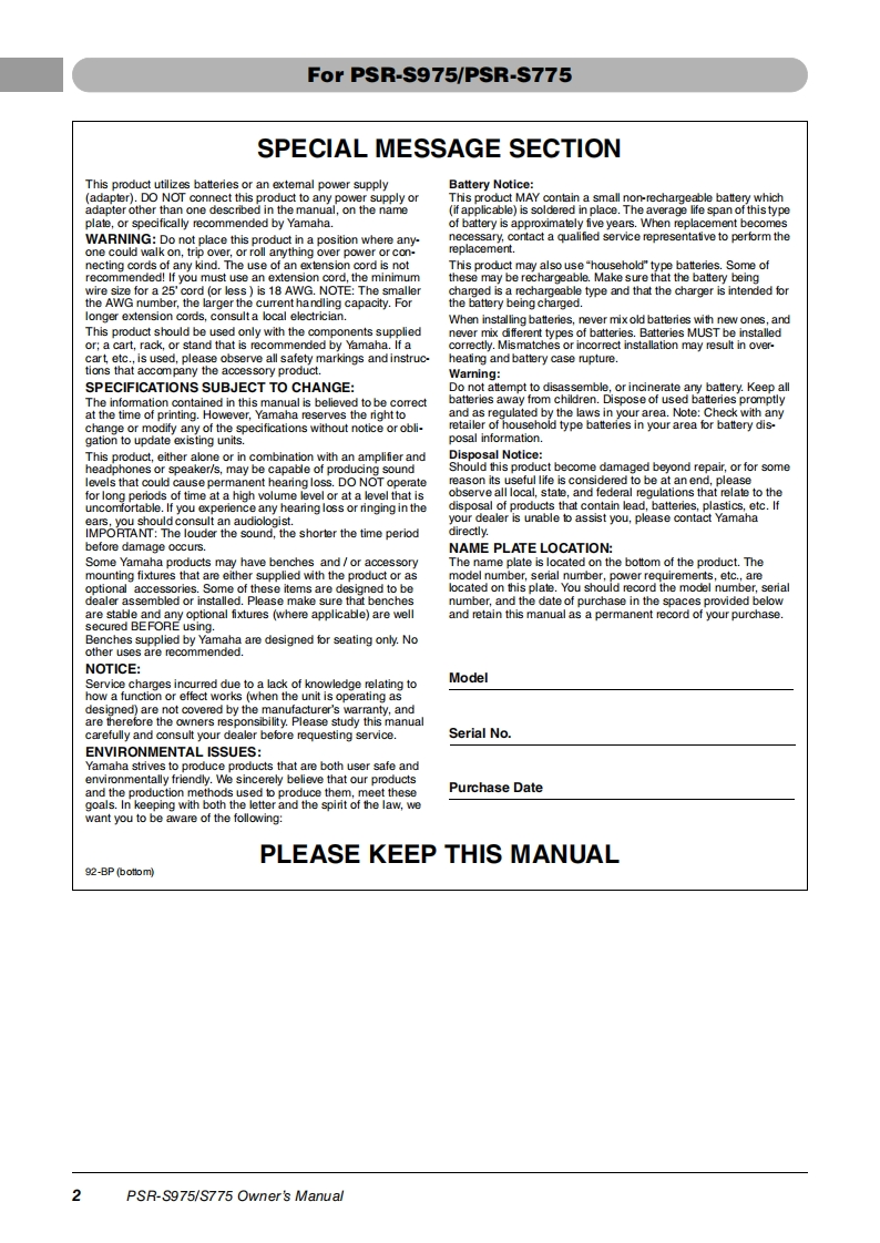 YAMAHAEnglishFrancaisPSR→≤R号Digital WorkstationClavier Arrangeur ProfessionnelOwner's ManualMode d'emploiThank you for purchasing this Yamaha Digital Workstation!This electric keyboard for professional entertainers not only has a wide selection of Voices andversatile functions but also gives you the potential of expanding content for the instrument.We recommend that you read this manual carefully so that you can fully take advantage of theadvanced and convenient functions of the instrument.We also recommend that you keep thismanual in a safe and handy place for future reference.Before using the instrument,be sure to read "PRECAUTIONS"on pages 5-6.Merci d'avoir choisi ce Clavier Arrangeur Professionnel YamahaCe clavier electrique destine aux professionnels dispose d'une large selection de sonoriteset de fonctions polyvalentes et offre un potentiel considerable pour l'largissement descontenus de l'instrument.Nous vous conseillons de lire attentivement ce mode d'emploi afin de tirer pleinement profitdes fonctions avancees et tres utiles de votre instrument.Nous vous recommandonsegalement de garder ce manuel a portee de main pour toute reference ulterieure.Avant d'utiliser I'instrument,lisez attentivement la section PRECAUTIONSD'USAGE aux pages 5 et 6.EN尚2XGS标澀FR