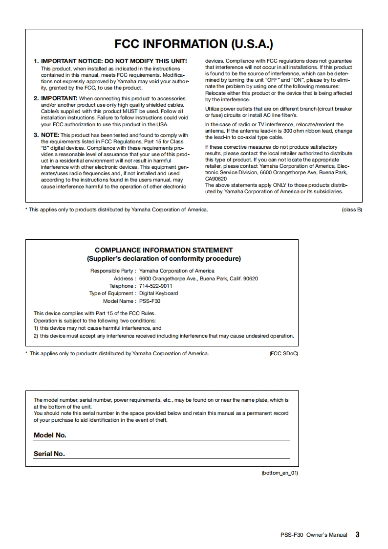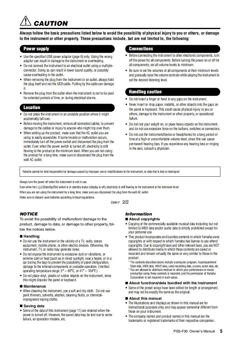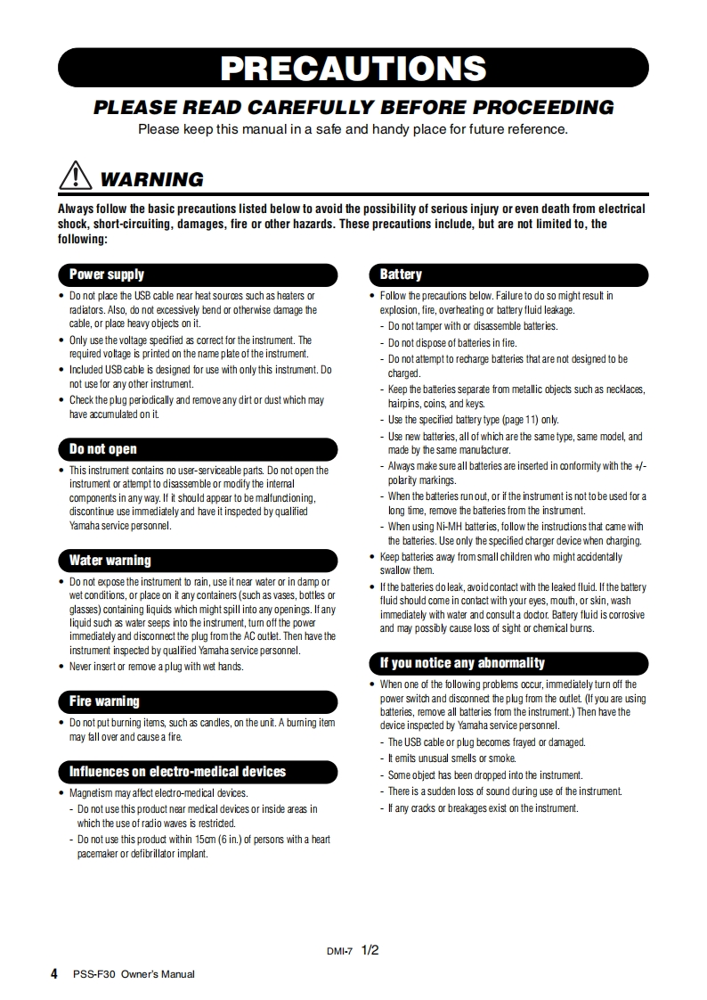 YAMAHAPSS-F30DIGITAL KEYBOARD口Owner's ManualThank you for purchasing this Yamaha Digital Keyboard!This instrument is a portable keyboard featuring a wide variety of sounds and functions.We recommend that you read this manual carefully so that you can fully take advantage of the advanced and convenientfunctions of the instrument.We also recommend that you keep this manual in a safe and handy place for future referenceBefore using the instrument,be sure to read "PRECAUTIONS"on pages 4-5.日EN