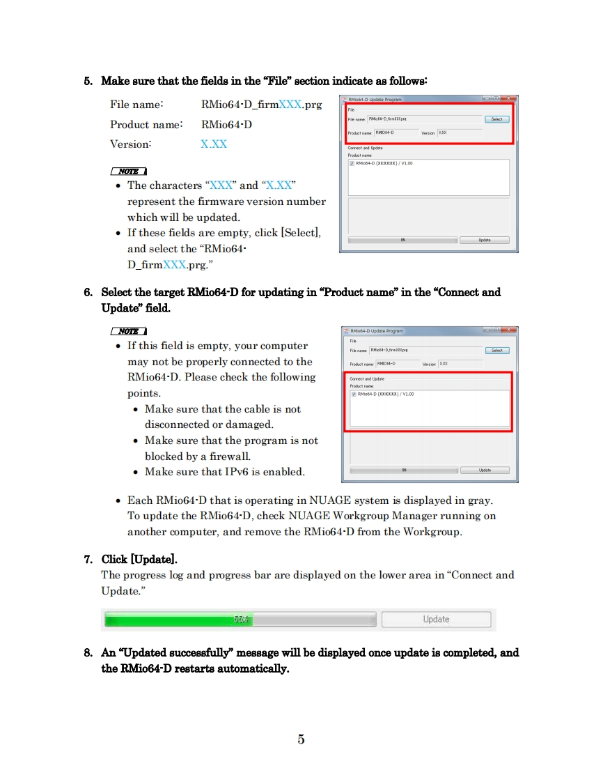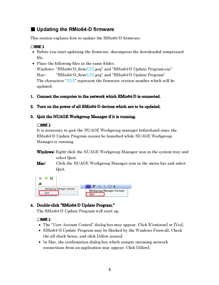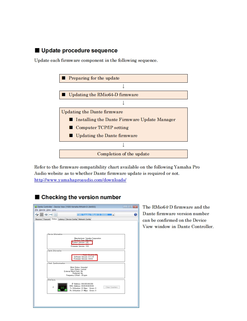 米YAMAHARMio64-D Firmware Update GuideThank you for choosing a Yamaha product.This guide explains how to update the RMio64-D firmware and its built-in Dantemodule firmware.N07From the Firmware V4.10,you can also update the firmware via the R Remote.Referto the“R Series Firmware Update Guide”and the“R Remote User Guide”for details.Precautions (Please be sure to read this section first!)The user assumes full responsibility for the update.Please note that the device may be damaged if you fail to follow these instructionsproperly,or turn off the device or disconnect the cable while the update is inprogress.If the update fails,and the device still does not operate correctly even after youexecute the update once again,please contact your Yamaha dealer.Yamaha Corporation owns exclusive copyrights for the RMio64-D firmware,itsupdate program,and the update guide.Audinate owns exclusive copyrights for the Dante firmware and its updateprogram.It is prohibited to duplicate or modify the firmware,software or guides,in part orin their entirety,without permission from the copyright owner.The screen shots in this guide are for use with this update procedure only and maybe different from the actual screen shots.Dante is a registered trademark of Audinate.Windows is a registered trademark of Microsoft Corporation in the United Statesand other countries.Mac,Macintosh,and Bonjour are trademarks of Apple Inc.registered in the U.S.and other countries.The company names and product names in this document are the trademarks orregistered trademarks of their respective companies.1
