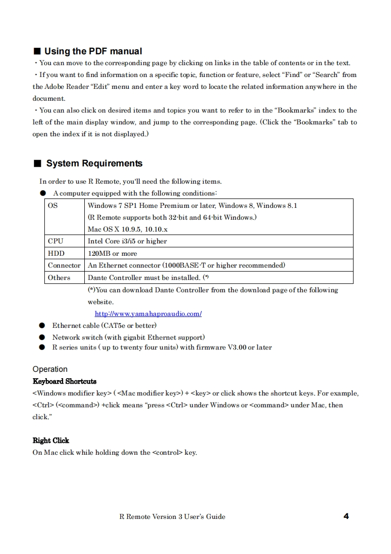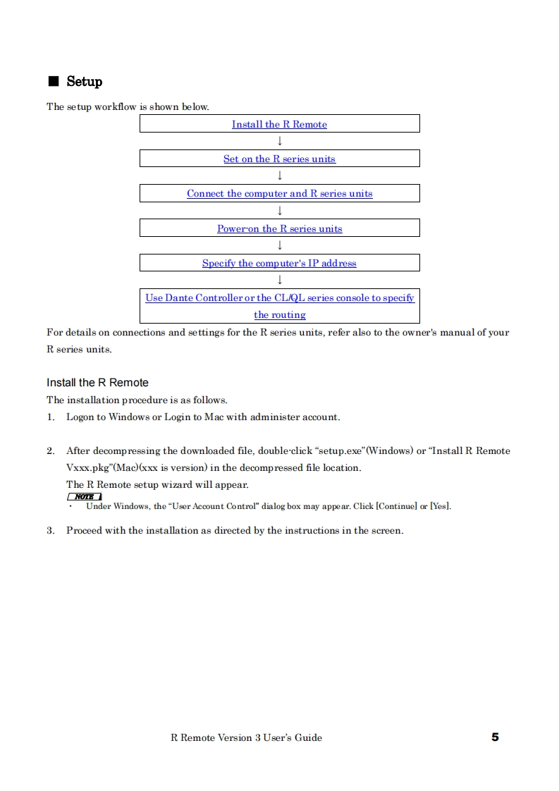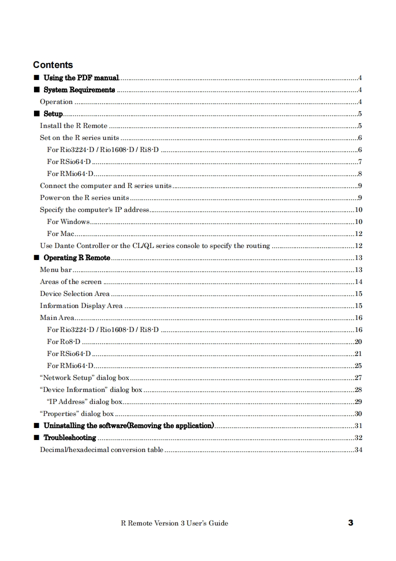 米YAMAHAR Remote Version 3User's GuideThank you for choosing a Yamaha product.This user's guide explains setup and use of"R Remote,"a Windows/Mac application that lets youmake parameter settings for the Rio3224-D/Rio1608-D/Ri8-D/Ro8-D/RSio64-D/RMio64-D(subsequently "R series")units.This application lets you edit the parameters of up to twenty four R series units from a singlecomputer.Even if the R series unit is not connected,you can mount it virtually and edit its settingsbeforehand.Up to two computers in which R Remote is installed can be connected to a single device.This means,for example,that the main operator could operate a console such as the CL while two assistants makedetailed adjustments at the other locations.●4●n●R Remote Version 3 User's Guide1
