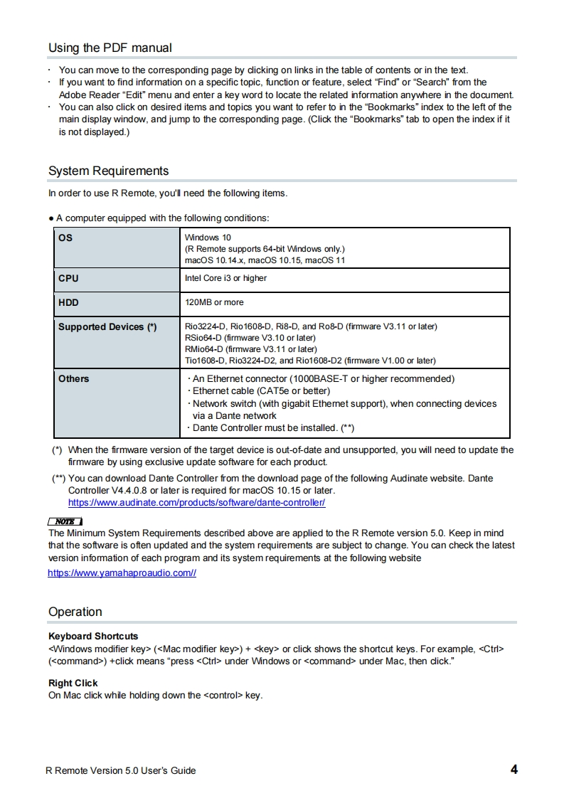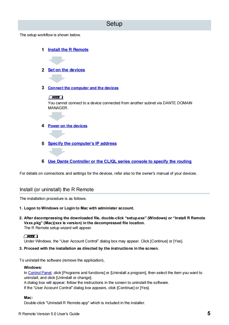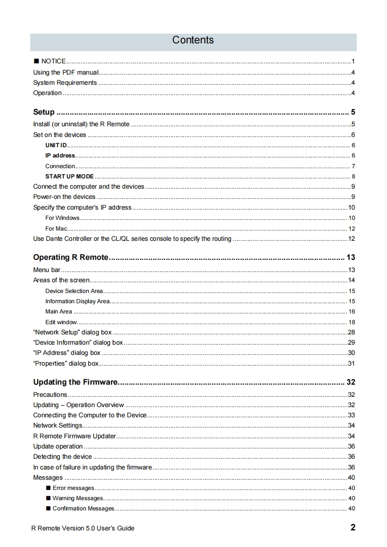 YAMAHAR Remote Version 5.0 User's GuideThank you for choosing a Yamaha product.This user's guide explains setup,firmware update and use of "R Remote,"a Windows/Mac application that letsyou make parameter settings for the Rio3224-D/Rio1608-D/Ri8-D/Ro8-D/RSio64-D/RMio64-D/Rio3224-D2/Rio1608-D2(subsequently "R series")and the Tio1608-D units.This application lets you edit the parameters of up to twenty-four devices from a single computer.Even if thedevice is not connected,you can mount it virtually and edit its settings beforehand.Up to two computers in which R Remote is installed can be connected to a single device.This means,forexample,that the main operator could operate a console such as the CL while two assistants make detailedadjustments at the other locations.■NOTICEYamaha Corporation owns exclusive copyrights for the R Remote,the firmware for each device,and the user's guide.It is prohibited to duplicate or modify the firmware,software or manuals,in part or in their entirety,without permission from the copyrightowner.The illustrations and screens as shown in this User's Guide are for instructional purposes,and may appear somewhat different from thescreens which appear on your computer.This software was not produced with the intention to support touch-panel operation in Windows 8.1/Windows 10,so we cannotguarantee operation if a touch-panel is used.Dante is a trademark of Audinate.Windows is a registered trademark of Microsoft Corporation in the United States and other countries.Mac and macOS are trademarks of Apple Inc.,registered in the U.S.and other countries.The company names and product names in this document are the trademarks or registered trademarks of their respective companies.This guide predominantly uses screenshots of Windows.However,Mac screenshots are used when instructions of the function applyonly to the Mac.This product incorporates open source software.For information about the software,refer to the "License Agreement,"accessed from the"Legal button on the "About R Remote"window.Software may be revised and updated without prior notice.R Remote Version 5.0 User's Guide1