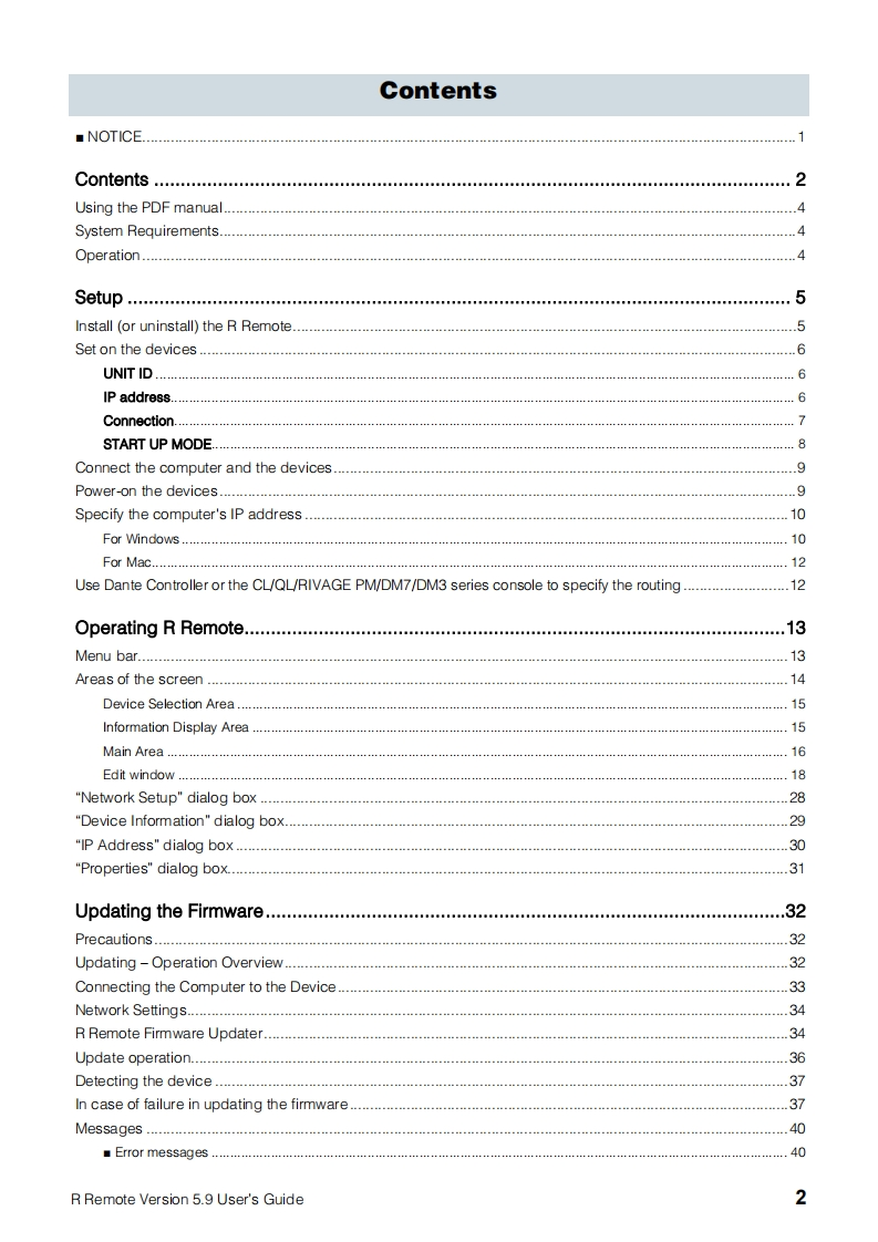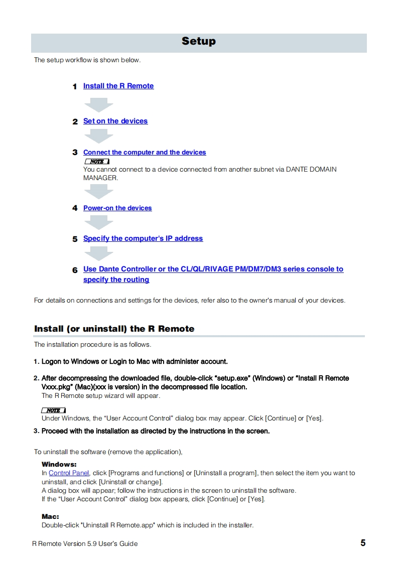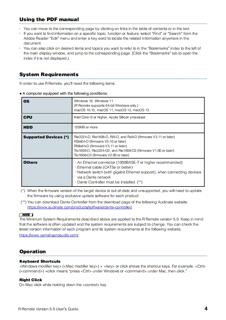 YAMAHAR Remote Version 5.9 User's GuideThank you for choosing a Yamaha product.This user's guide explains setup,firmware update and use of'R Remote,'a Windows/Mac application that letsyou make parameter settings for the Rio3224-D/Rio1608-D/Ri8-D/Ro8-D/RSio64-D/RMio64-D/Rio3224-D2/Rio1608-D2(subsequently'R series")and the Tio1608-D/Tio1608-D2 units.This application lets you edit the parameters of up to twenty-four devices from a single computer.Even if thedevice is not connected,you can mount it virtually and edit its settings beforehand.Up to two computers in which R Remote is installed can be connected to a single device.This means,forexample,that the main operator could operate a console such as the CL while two assistants make detailedadjustments at the other locations.NOTICE.Yamaha Corporation owns exclusive copyrights for the R Remote,the firmware for each device,and the user's guide.It is prohibited to duplicate or modify the firmware,software or manuals,in part or in their entirety,without permission from the copyrightowner.The illustrations and screens as shown in this User's Guide are for instructional purposes,and may appear somewhat different from thescreens which appear on your computer.This software was not produced with the intention to support touch-panel operation in Windows 10 Windows 11,so we cannotguarantee operation if a touch-panel is used.Dante is a trademark of Audinate..Windows is aregistered trademark of MicrosoftCorporation in the United States and other countries.Mac and macOS are trademarks of Apple Inc.,registered in the U.S.and other countries.The company names and product names in this document are the trademarks or registered trademarks of their respective companiesThis guide predominantly uses screenshots of Windows.However,Mac screenshots are used when instructions of the function applyonly to the Mac..This product incorporates open source software.For information about the software,refer to the "License Agreement,"accessed fromthe "Legal"button on the "About R Remote"window.Software may be revised and updated without prior notice.ENR Remote Version 5.9 User's Guide