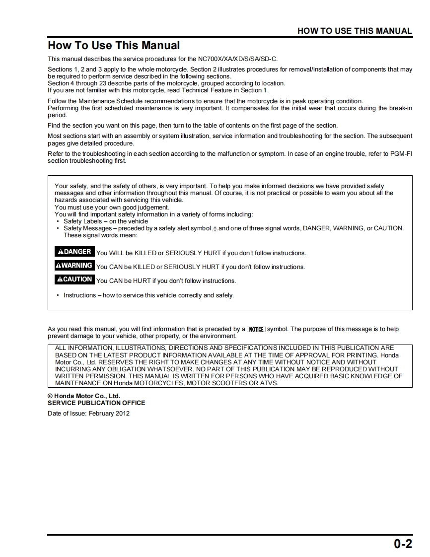 HOW TO USE THIS MANUALA Few Words About SafetyService InformationThe service and repair information contained in this manual is intended for use by qualified,professional technicians.Attemptingservice or repairs without the proper training,tools,and equipment could cause injury to you or others.It could also damage thevehicle or create an unsafe condition.This manual describes the proper methods and procedures for performing service,maintenance and repairs.Some proceduresrequire the use of specially designed tools and dedicated equipment.Any person who intends to use a replacement part,serviceprocedure or a tool that is not recommended by Honda.must determine the risks to their personal safety and the safe operation ofthe vehicle.If you need to replace a part,use genuine Honda parts with the correct part number or an equivalent part.We strongly recommendthat you do not use replacement parts of inferior quality.For Your Customer's SafetyProper service and maintenance are essential to the customer's safety and the reliability of the vehicle.Any error or oversight whileservicing a vehicle can result in faulty operation,damage to the vehicle,or injury to others.AWARNINGImproper service or repairs can create an unsafecondition that can cause your customer or others tobe seriously hurt or killed.Follow the procedures and precautions in thismanual and other service materials carefully.For Your SafetyBecause this manual is intended for the professional service technician,we do not provide warnings about many basic shop safetypractices (e.g.,Hot parts-wear gloves).If you have not received shop safety training or do not feel confident about your knowledgeof safe servicing practice,we recommend that you do not attempt to perform the procedures described in this manual.Some of the most important general service safety precautions are given below.However,we cannot warn you of everyconceivable hazard that can arise in performing service and repair procedures.Only you can decide whether or not you shouldperform a given task.AWARNINGFailure to properly follow instructions andprecautions can cause you to be seriously hurt orki训led.Follow the procedures and precautions in thismanual carefully.Important Safety PrecautionsMake sure you have a clear understanding of all basic shop safety practices and that you are wearing appropriate clothing andusing safety equipment.When performing any service task,be especially careful of the following:Read all of the instructions before you begin,and make sure you have the tools,the replacement or repair parts,and the skillsrequired to perform the tasks safely and completely.Protect your eyes by using proper safety glasses,goggles or face shields any time you hammer,drill,grind,pry or work aroundpressurized air or liquids,and springs or other stored-energy components.If there is any doubt,put on eye protection.Use other protective wear when necessary,for example gloves or safety shoes.Handling hot or sharp parts can cause severeb