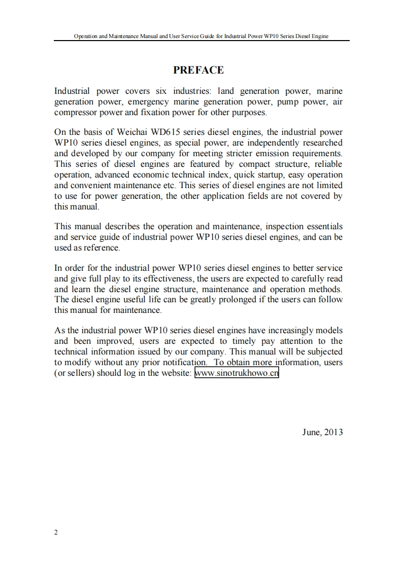 Operation-and-Maintenance-Manual-of-WEICHAI-WP13D-Series-Diesel-Engines348072@abc1个月前发布关注私信0.95MB53页048Operation-and-Maintenance-Manual-of-WEICHAI-WP13D-Series-Diesel-Engines此内容为付费资源,请付费后查看¥19¥23黄金会员免费钻石会员免费立即购买您当前未登录!建议登陆后购买,可保存购买订单付费资源 第1页 / 共53页 第2页 / 共53页 第3页 / 共53页 第4页 / 共53页 第5页 / 共53页 试读已结束,还剩48页,您可下载完整版后进行离线阅读 THE END说明书手册 文本预览 Operation and Maintenance Manual and User Service Guide for Industrial Power WP10 Series Diesel EngineOperation and Maintenance Manual andUser Service Guide for Industrial PowerWP10 Series Diesel Engine1 查看更多 收起部分 喜欢就支持一下吧收藏