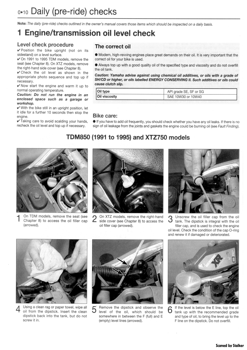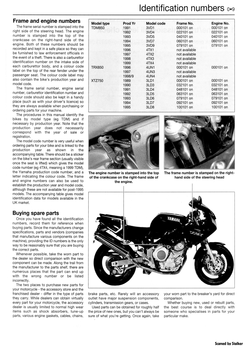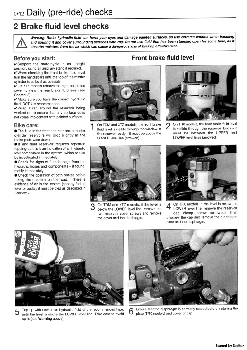 o-8 Safety first!Professional mechanics are trained in safeAlways disconnect the battery earthAlways disconnect the battery groundworking procedures.However enthusiasticterminal before working on any part of the fuel(earth)terminal before working on the fuel oryou may be about getting on with the job ator electrical system,and never risk spillingelectrical systems (except where noted)hand,take the time to ensure that your safetyfuel on to a hot engine or exhaust.If possible,loosen the filler plugs or coveris not put at risk.A moment's lack of attentionIt is recommended that a fire extinguisherwhen charging the battery from an externalcan result in an accident,as can failure toof a type suitable for fuel and electrical fires issource.Do not charge at an excessive rate orobserve simple precautions.kept handy in the garage or workplace at allthe battery may burst.There will always be new ways of havingtimes.Never try to extinguish a fuel orTake care when topping up,cleaning oraccidents,and the following is not aelectrical fire with water.carrying the battery.The acid electrolyte,comprehensive list of all dangers;it isevenwhen diluted,is very corrosive andintended rather to make you aware of the risksFumesshould not be allowed to contact the eyes orand to encourage a safe approach to all workCertain fumes are highly toxic and canskin.Always wear rubber gloves and gogglesyou carry out on your bike.quickly cause unconsciousness and evenor a face shield.If you ever need to prepareAsbestosdeath if inhaled to any extent.Petrol vapourelectrolyte yourself,always add the acidcomes into this category,as do the vapoursslowly to the water;never add the water to theCertain friction,insulating,sealing andfrom certain solvents such as trichloro-acid.other products such as brake pads,clutchethylene.Any draining or pouring of suchlinings,gaskets,etc.contain asbestos.volatile fluids should be done in a wellElectricityExtreme care must be taken to avoidventilated area.When using an electric power tool,inhalation of dust from such products since itWhen using cleaning fluids and solvents,inspection light etc.,always ensure that theis hazardous to health.If in doubt,assumeread the instructions carefully.Never useappliance is correctly connected to its plugthat they do contain asbestos.materials from unmarked containers theyand that,where necessary,it is properlyFiremay give off poisonous vapours.grounded (earthed).Do not use suchNever run the engine of a motor vehicle inappliances in damp conditions and,again,Remember at all times that petrol is highlyan enclosed space such as a garage.Exhaustbeware of creating a spark or applyingflammable.Never smoke or have any kind offumes contain carbon monoxide which isexcessive heat in the vicinity of fuel or fuelnaked flame around,when working on theextremely poisonous;if you need to run thevapour.Also ensure that the appliances meetvehicle.But the risk does not end there-aengine,always do so in the open air or at leastnational sa