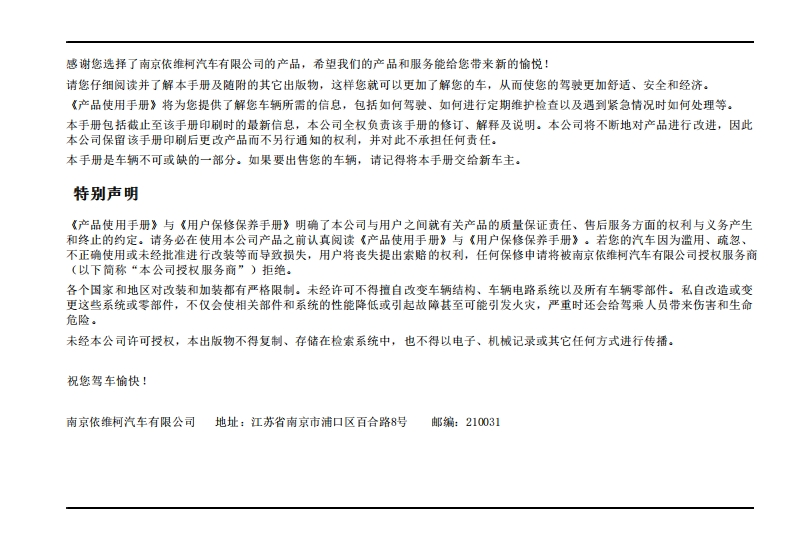 感谢您选择了南京依维柯汽车有限公司的产品,希望我们的产品和服务能给您带来新的愉悦!请您仔细阅读并了解本手册及随附的其它出版物,这样您就可以更加了解您的车,从而使您的驾驶更加舒适、安全和经济。《产品使用手册》将为您提供了解您车辆所需的信息,包括如何驾驶、如何进行定期维护检查以及遇到紧急情况时如何处理等。本手册包括截止至该手册印刷时的最新信息,本公司全权负责该手册的修订、解释及说明。本公司将不断地对产品进行改进,因此本公司保留该手册印刷后更改产品而不另行通知的权利,并对此不承担任何责任。本手册是车辆不可或缺的一部分。如果要出售您的车辆,请记得将本手册交给新车主。特别声明《产品使用手册》与《用户保修保养手册》明确了本公司与用户之间就有关产品的质量保证责任、售后服务方面的权利与义务产生和终止的约定。请务必在使用本公司产品之前认真阅读《产品使用手册》与《用户保修保养手册》。若您的汽车因为滥用、疏忽、不正确使用或未经批准进行改装等而导致损失,用户将丧失提出索赔的权利,任何保修申请将被南京依维柯汽车有限公司授权服务商(以下简称“本公司授权服务商”)拒绝。各个国家和地区对改装和加装都有严格限制。未经许可不得擅自改变车辆结构、车辆电路系统以及所有车辆零部件。私自改造或变更这些系统或零部件,不仅会使相关部件和系统的性能降低或引起故障甚至可能引发火灾,严重时还会给驾乘人员带来伤害和生命危险。未经本公司许可授权,本出版物不得复制、存储在检索系统中,也不得以电子、机械记录或其它任何方式进行传播。祝您驾车愉快!南京依维柯汽车有限公司地址:江苏省南京市浦口区百合路8号邮编:210031