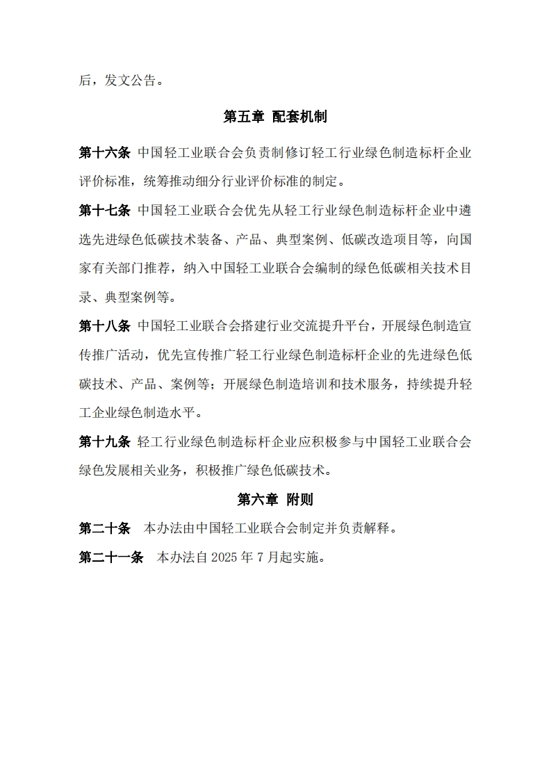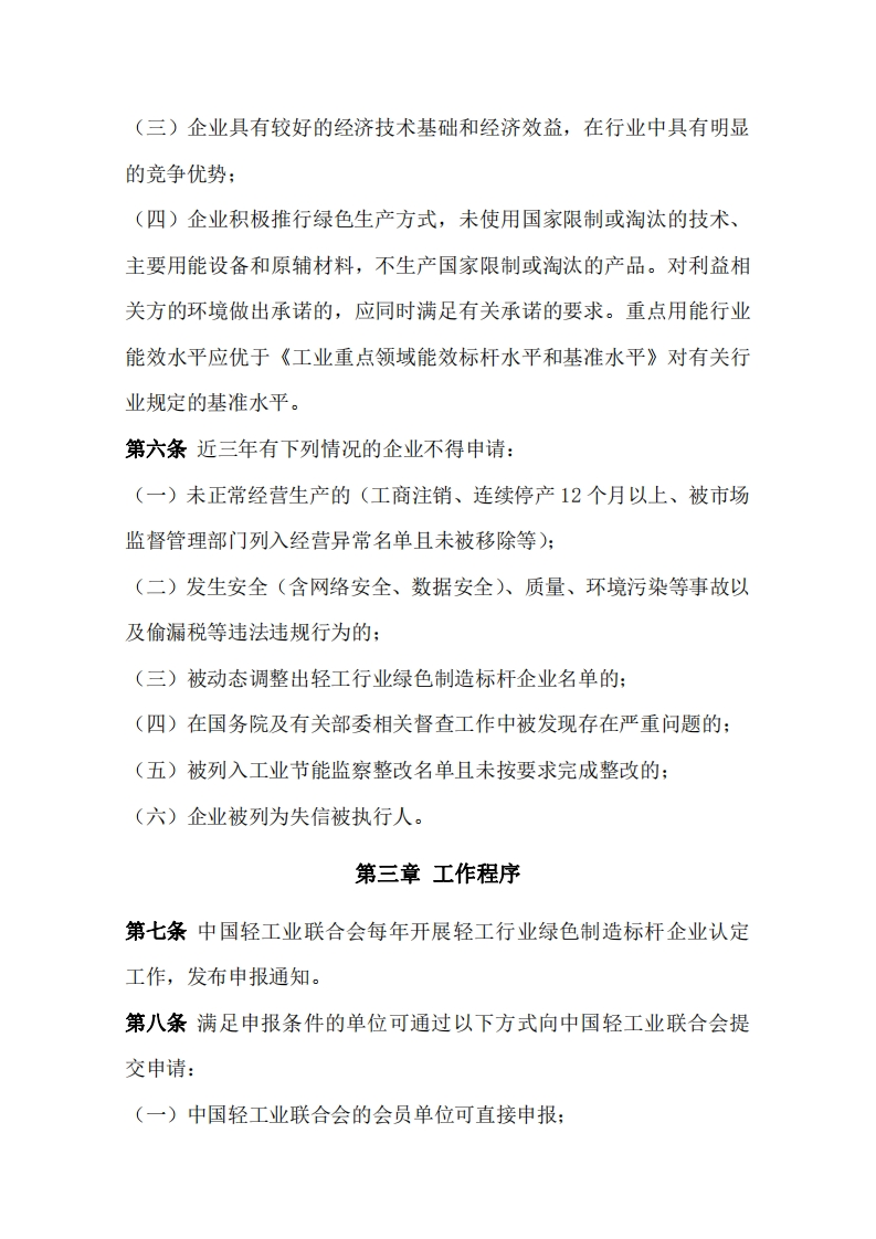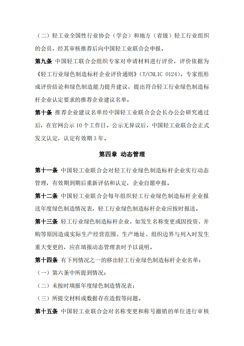 附件:轻工行业绿色制造标杆企业认定管理办法(暂行)第一章总则第一条为深入贯彻习近平生态文明思想,落实《中华人民共和国国民经济和社会发展第十四个五年规划和2035年远景目标纲要》,提升轻工业绿色制造能力,打造绿色制造领军力量,全面推动轻工业绿色发展,根据《工业领域碳达峰实施方案》《“十四五”工业绿色发展规划》、《关于加快推动制造业绿色化发展的指导意见》等文件,中国轻工业联合会在轻工行业组织开展绿色制造标杆企业认定工作,特制定本办法。第二条本办法适用于轻工行业绿色制造标杆企业的认定工作。第三条本办法所称绿色制造标杆企业是指实行绿色生产方式、坚持可持续发展理念的生产型企业,其绿色制造水平、低碳发展水平、可持续发展能力在轻工行业具有显著先进性、示范性和引领性。第四条中国轻工业联合会负责轻工行业绿色制造标杆企业的认定和动态管理,组织制定评价标准,遴选发布认定名单,不收取任何费用。认定遵循公开、公平、公正和企业自愿的原则。第二章申报条件第五条申请单位应具备以下基本条件:(一)在中华人民共和国境内依法注册、设立,从事轻工产品生产的制造企业,下设多个独立法人子公司的,应单独申报:
