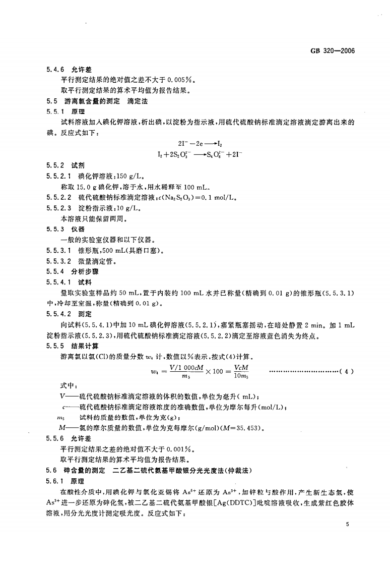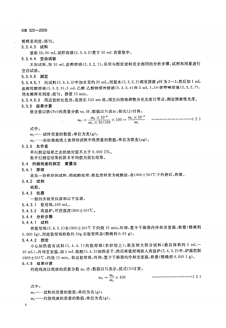 GB320-2006工业用合成盐酸1范围本标准规定了工业用合成盐酸的要求、采样、试验方法、检验规则及标志、包装、运输和贮存、安全。本标准适用于由氯气和氧气合成的氯化氢气体,用水吸收制得的工业用合成盐酸.2规范性引用文件下列文件中的条款通过本标准的引用而成为本标准的条款。凡是注日期的引用文件,其随后所有的修攻单(不包括勘误的内容)或修订版均不适用于本标准,然而,鼓励根据本标准达成协议的各方研究是否可使用这些文件的最新版本。凡是不注日期的引用文件,其最新版本适用于本标准。GB190危险货物包装标志GB/T191包装储运图示标志(GB/T191一2000,eqv IS0780:1997)GB/T 601化学试剂标准滴定溶液的制备GB/T 602化学试剂杂质测定用标准溶液的制备(GB/T602一2002,IS06353-1:1982,NEQ)GB/T603化学试剂试验方法中所用制剂及制品的制备(GB/T603一2002,IS06353-1:1982,NEQ)GB/T1250极限数值的表示方法和判定方法GB/T6678化工产品采样总则(GB/T6678一1986,neq ASTM E300:1983)GB/T6680液体化工产品采样通则(GB/T6680一1986,neq BS5309:1976)GB/T6682分析实验室用水规格和试验方法(GB/T6682一1992,eqv IS(03696:1987)3要求3.1外观:工业用合成盐酸为无色或浅黄色透明液体。3.2工业用合成盐酸应符合表1给出的指标要求。表1指标%项优等品一等品合格品总酸度(以HC1计)的质量分数华31.0铁(以Fe计)的质量分数系0.0020.0080.01灼烧残流的质量分数≤0.050.100.15游离氯(以CI计)的质量分数≤0.0040.0080.01砷的质量分数60.0001硫酸盐(以S0计)的质量分数0.0050.03≤注:碑指标强制。4采样4.1产品按批检验。生产企业以每一成品槽或每一生产周期生产的工业用合成盐酸为一批。用户以每次收到的同一批次的工业用合成盐酸为一批。1