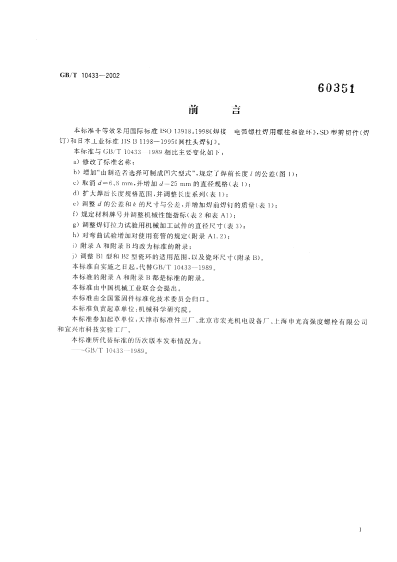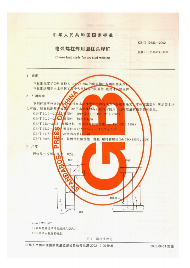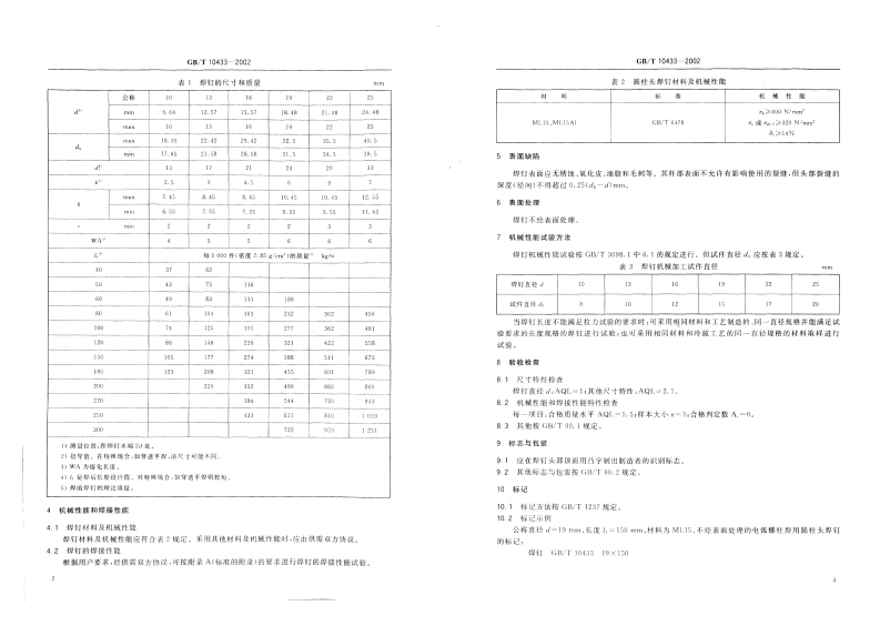 GB-T10433-2002-dinh-han-hieu-XL348072@abc5天前发布关注私信2.29MB5页04811GB-T10433-2002-dinh-han-hieu-XL此内容为付费资源,请付费后查看¥17¥19黄金会员免费钻石会员免费立即购买您当前未登录!建议登陆后购买,可保存购买订单付费资源 第1页 / 共5页 第2页 / 共5页 第3页 / 共5页 第4页 / 共5页 第5页 / 共5页 已完成全部阅读,共5页 © 版权声明文章版权归作者所有,未经允许请勿转载。THE END标准规范 文本预览 J13GB中华人民共和国国家标准GB/T10433-200260351电弧螺柱焊用圆柱头焊钉Cheese head studs for arc stud weldingBTB2002-12-05发布2003-06-01实施中华人民共和国国家质量监督检验检疫总局发布 查看更多 收起部分 喜欢就支持一下吧点赞11 分享QQ空间微博QQ好友海报分享复制链接收藏