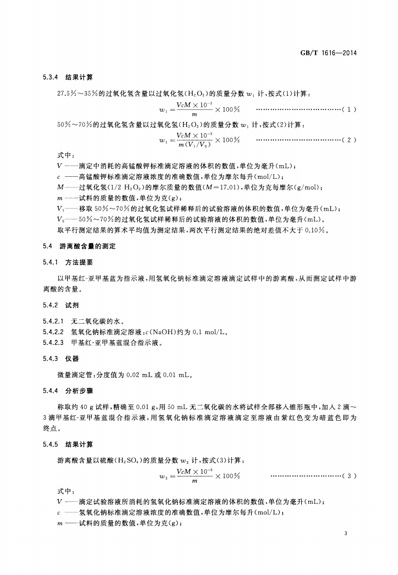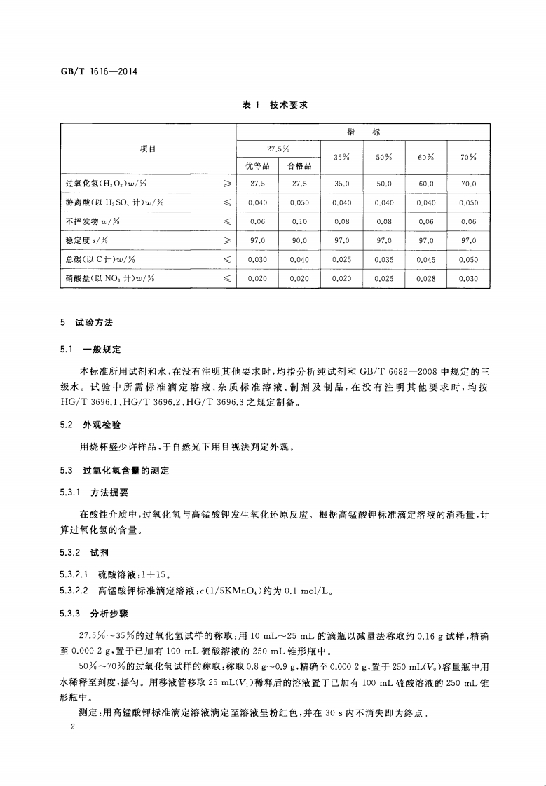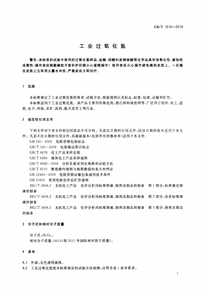 GBT-1616-2014-工业过氧化氢348072@abc5天前发布关注私信0.43MB12页0408GBT-1616-2014-工业过氧化氢此内容为付费资源,请付费后查看¥17¥19黄金会员免费钻石会员免费立即购买您当前未登录!建议登陆后购买,可保存购买订单付费资源 第1页 / 共12页 第2页 / 共12页 第3页 / 共12页 第4页 / 共12页 第5页 / 共12页 试读已结束,还剩7页,您可下载完整版后进行离线阅读 © 版权声明文章版权归作者所有,未经允许请勿转载。THE END标准规范 文本预览 1Cs71.060.20G13中华人民共和国国家标准GB/T1616-2014代替GB1616-2003工业过氧化氢Hydrogen peroxide for industrial use2014-07-08发布2014-12-01实施中华人民共和国国家质量监督检验检疫总局中国国家标准化管理委员会发布 查看更多 收起部分 喜欢就支持一下吧点赞8 分享QQ空间微博QQ好友海报分享复制链接收藏