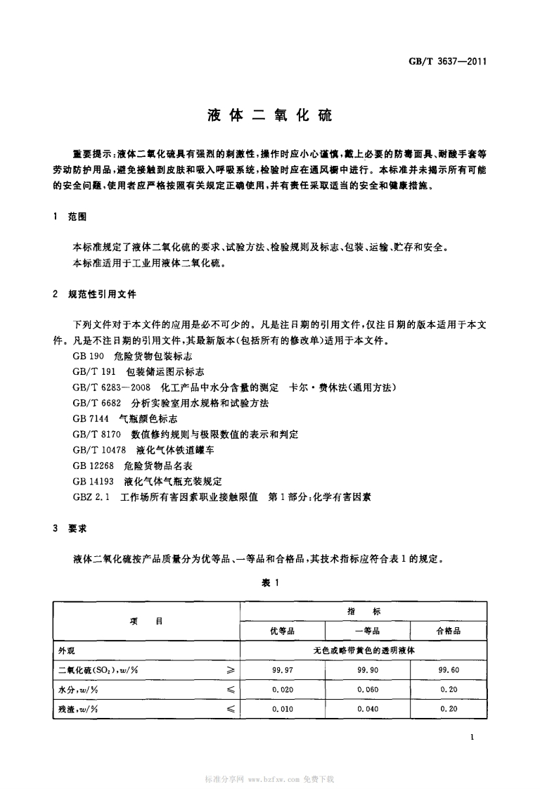 GBT-3637-2011-液体二氧化硫348072@abc5天前发布关注私信0.21MB10页03814GBT-3637-2011-液体二氧化硫此内容为付费资源,请付费后查看¥17¥19黄金会员免费钻石会员免费立即购买您当前未登录!建议登陆后购买,可保存购买订单付费资源 第1页 / 共10页 第2页 / 共10页 第3页 / 共10页 第4页 / 共10页 第5页 / 共10页 试读已结束,还剩5页,您可下载完整版后进行离线阅读 © 版权声明文章版权归作者所有,未经允许请勿转载。THE END标准规范 文本预览 ICS71.060.20G13GB中华人民共和国国家标准GB/T3637-2011代替GB/T3637-1993液体二氧化硫Liquid sulphur dioxide2011-12-30发布2012-06-01实施中华人民共和国国家质量监督检验检疫总局中国国家标准化管理委员会发布 查看更多 收起部分 喜欢就支持一下吧点赞14 分享QQ空间微博QQ好友海报分享复制链接收藏