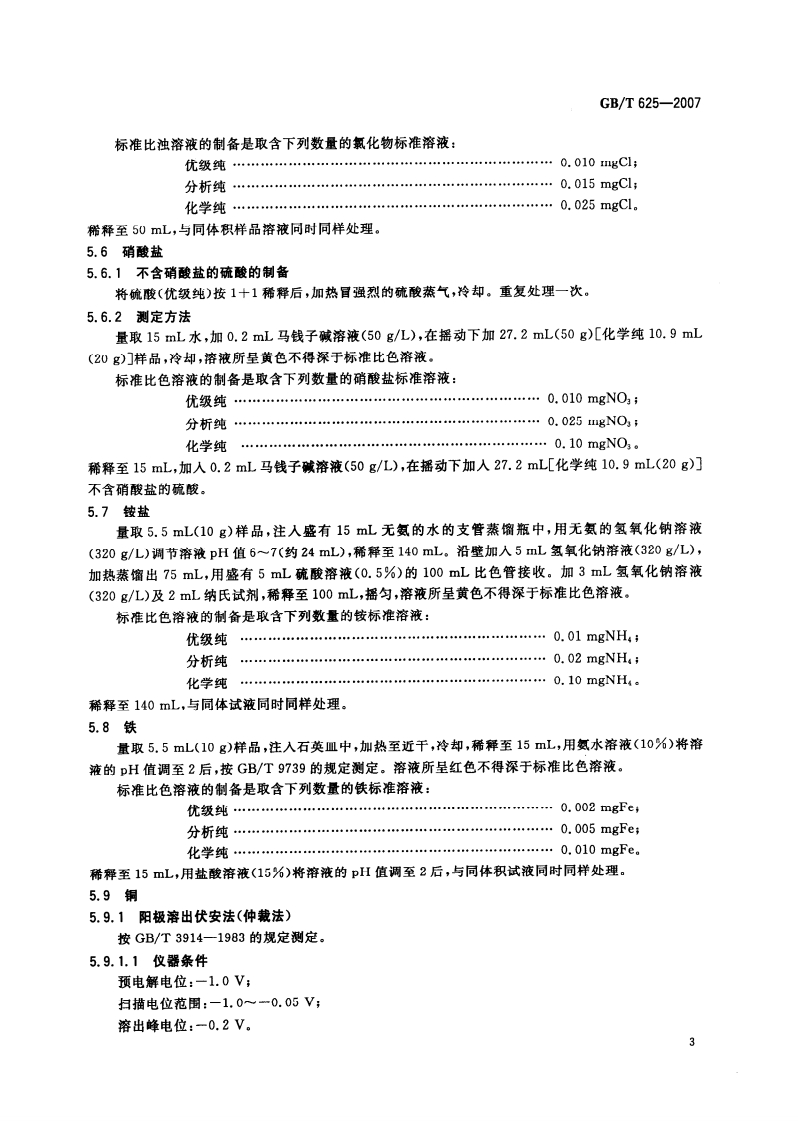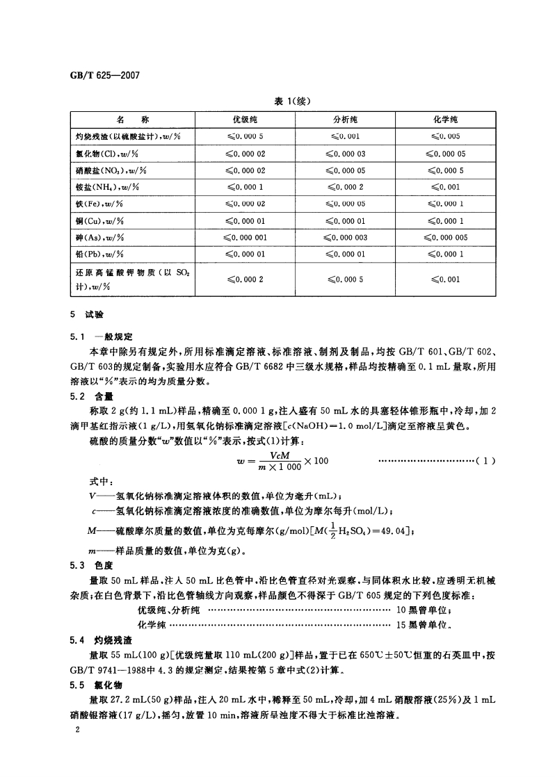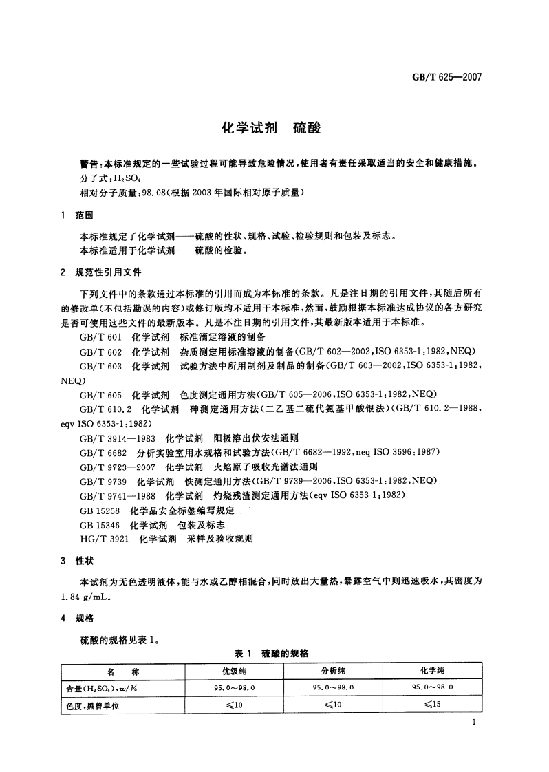 1CS71.040.30G62GB中华人民共和国国家标准GB/T625-2007代替GB/T625一1989化学试剂硫酸Chemical reagent-Sulfuric acid(ISO 6353-2:1983,Reagents for chemical analysis-Part 2:Specifications-First series,NEQ)2007-10-25发布2008-04-01实施中华人民共和国国家质量监督检验检疫总局中国国家标准化管理委员会发布