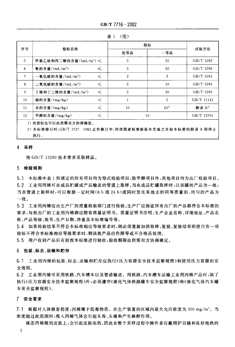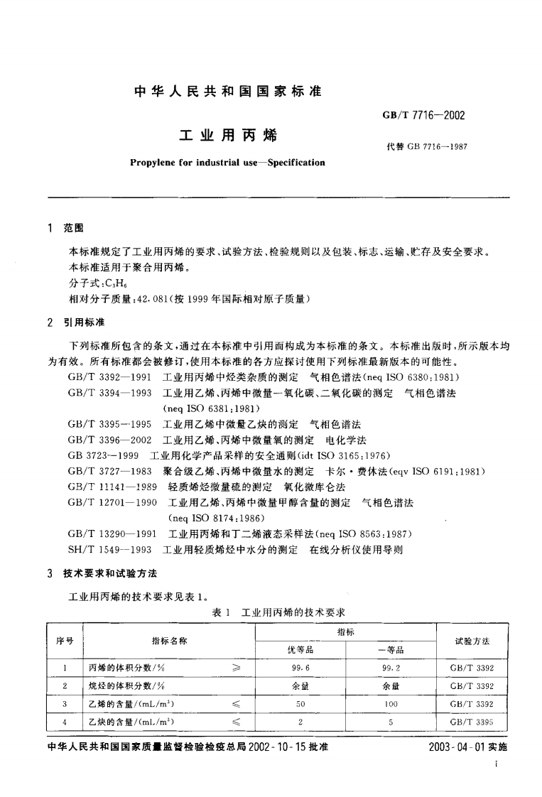 GBT-7716-2002-工业用丙烯348072@abc6天前发布关注私信0.13MB6页0369GBT-7716-2002-工业用丙烯此内容为付费资源,请付费后查看¥17¥19黄金会员免费钻石会员免费立即购买您当前未登录!建议登陆后购买,可保存购买订单付费资源 第1页 / 共6页 第2页 / 共6页 第3页 / 共6页 第4页 / 共6页 第5页 / 共6页 试读已结束,还剩1页,您可下载完整版后进行离线阅读 © 版权声明文章版权归作者所有,未经允许请勿转载。THE END标准规范 文本预览 1Cs71.080.01G16GB中华人民共和国国家标准GB/T7716-2002工业用丙烯Propylene for industrial use-Specification2002-10-15发布2003-04-01实施中华人民共和国国家质量监督检验检疫总局发布 查看更多 收起部分 喜欢就支持一下吧点赞9 分享QQ空间微博QQ好友海报分享复制链接收藏