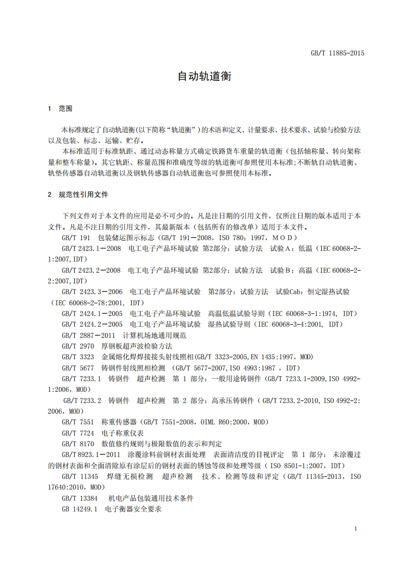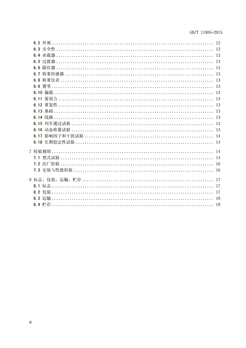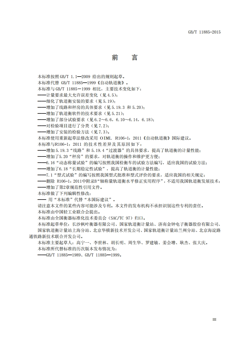 GB/T11885-2015目次前言..III1范围.…12规范性引用文件13术语和定义24计量要求54.1计量单位54.2称量范围.54.3准确度等级54.4检定分度值4.5最大允许误差64.6影响量...74.7长期稳定性75技术要求.…75.1轨道衡的组成75.2适用性.…75.3安全性.…75.4欺骗性使用85.5意外失调85.6误操作.85.7承载器..……85.8过渡器.85.9限位器.…85.10称重传感器85.11称重仪表.…85.12置零装置85.13预热时间.……95.14接口..95.15称量结果的指示........95.16累计..95.17车辆识别装置95.18材料、加工和装配要求95.19安装..105.20秤房.....115.21软件..115.22防护措施.e6试验与检验方法126.1试验标准器12