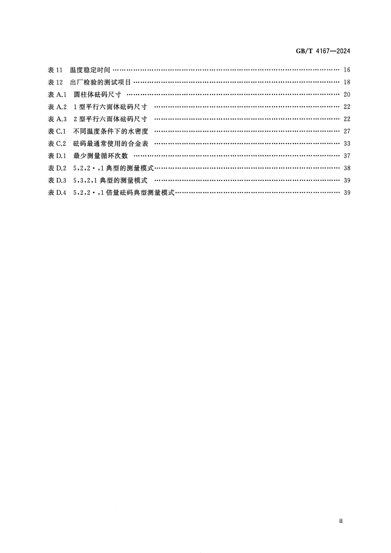 GBT4167-2024砝码348072@abc1个月前发布关注私信5.21MB48页046GBT4167-2024砝码此内容为付费资源,请付费后查看¥17¥19黄金会员免费钻石会员免费立即购买您当前未登录!建议登陆后购买,可保存购买订单付费资源 第1页 / 共48页 第2页 / 共48页 第3页 / 共48页 第4页 / 共48页 第5页 / 共48页 试读已结束,还剩43页,您可下载完整版后进行离线阅读 THE END标准规范 文本预览 ICS17.100CCS N 13中华人民共和国国家标准GB/T4167-2024代替GB/T4167一2011砝码Weights2024-11-28发布2025-06-01实施国家市场监督管理总局国家标准化管理委员会发布 查看更多 收起部分 喜欢就支持一下吧收藏