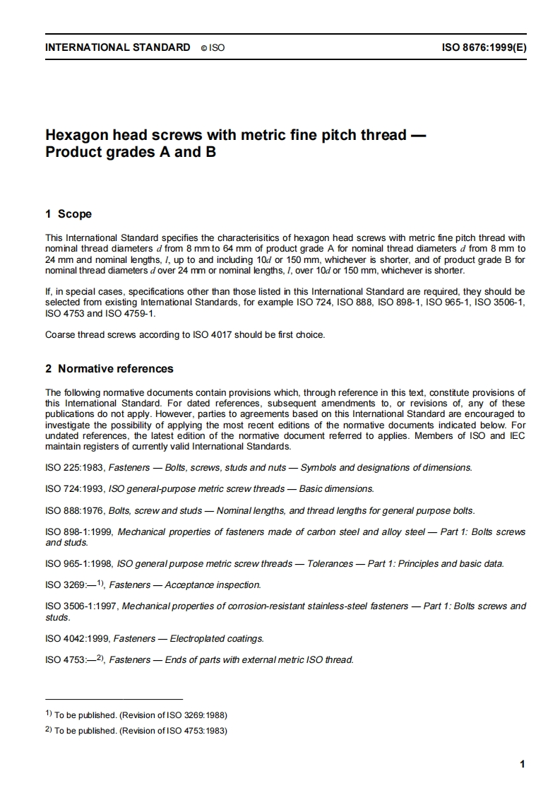 INTERNATIONALISOSTANDARD8676Second edition1999-08-15Hexagon head screws with metric fine pitchthread-Product grades A and BVis a tete hexagonale a filetage metrique a pas fin entierement filetees-Grades A et BIS0】山必Reference number1S08676:1999(E