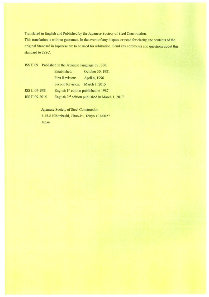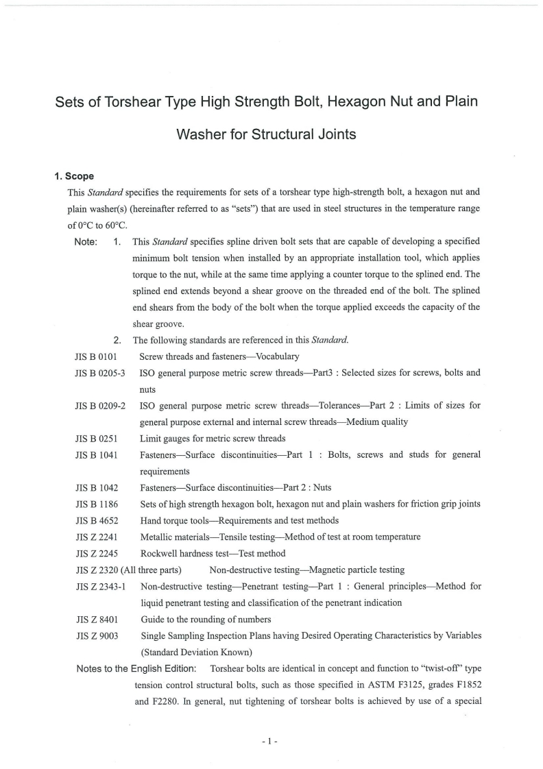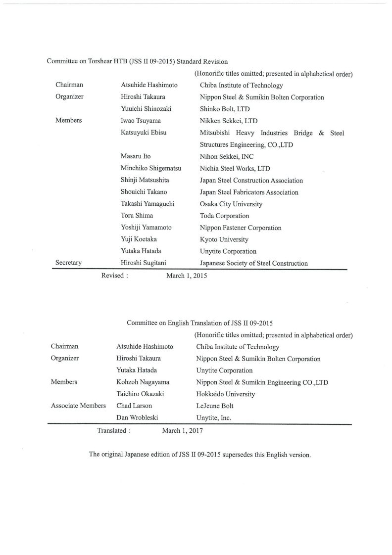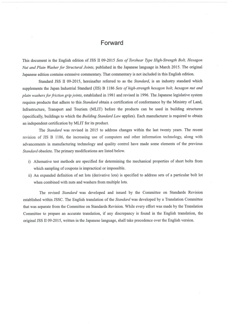 Japanese Society of Steel Construction StandardII-09附Standard of Japanese Society of Steel ConstructionJSSI109-2015Sets of Torshear Type High-Strength Bolt,Hexagon Nut andPlain Washer for Structural JointsTranslated and Published by theJapanese Society of Steel Construction