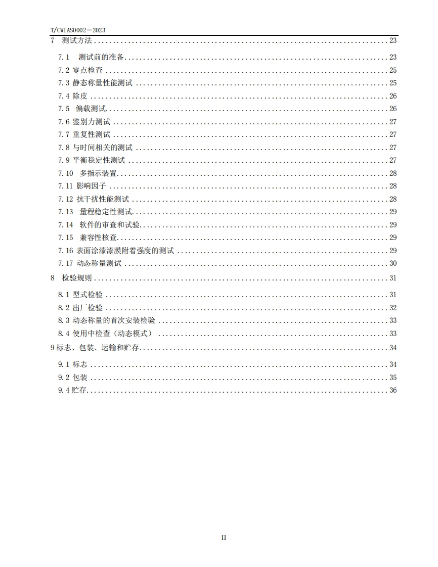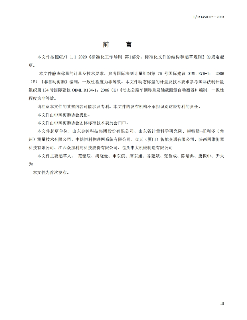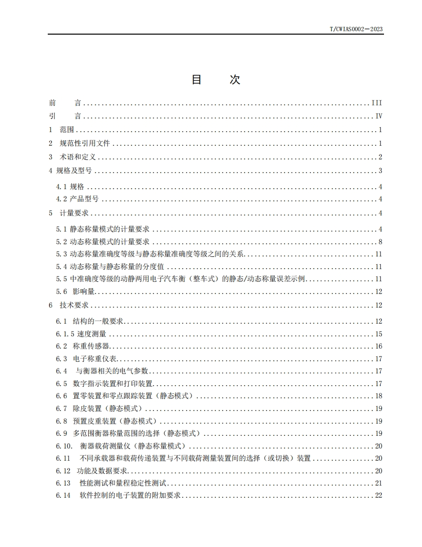 T/CWIAS0002-20231CS17.100N13团体标准T/CWIAS0002-2023动静两用电子汽车衡(整车式)Electronic truck scale for bothdynamic and static weighing Weighing whole loads)(0IML R76-1:2006 (E),Non-automatic weighing instrumentsPart 1:Metrological and technical requirements-Test,NEQOIML R134-1:2006 (E),Automatic instruments for weighing roadvehicles in motion and measur ing axle loadsPart 1:Metrological and technical requirement-Tests,NEQ)2023-05-29发布2023-09-01实施中国衡衡器协会发布