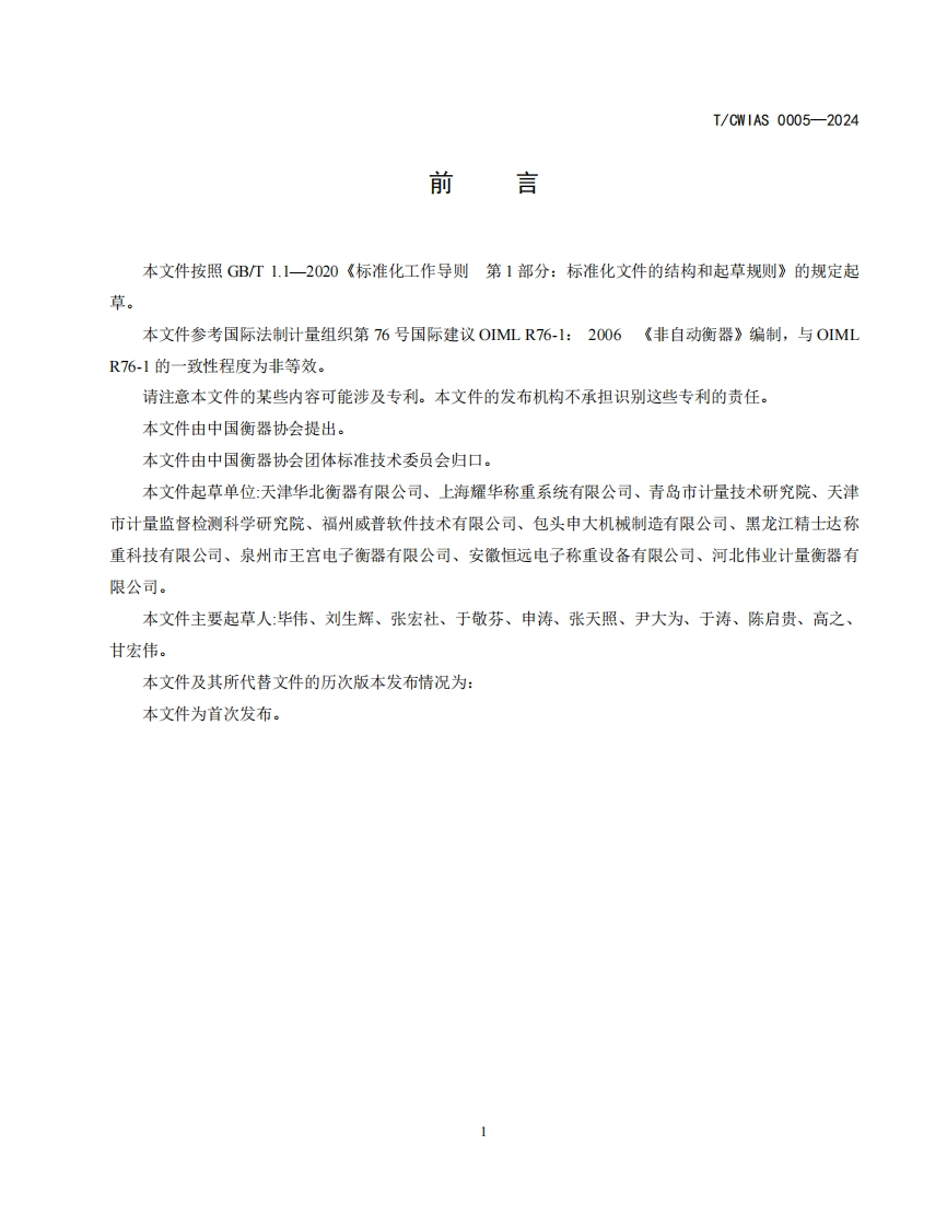 ICS17.100N13团体标准T/CWIAS0005-2024机动车整备质量轴(轮)重检测仪Detecting instrument for kerb mass of motor vehicle and axle(wheel)(OIML R76-1:2006,Non-automatic weighing instrumentsPart 1:Metrological and technical requirements-Tests,NEQ)2024-01-25发布2024-07-01实施中国衡衡器协会发布