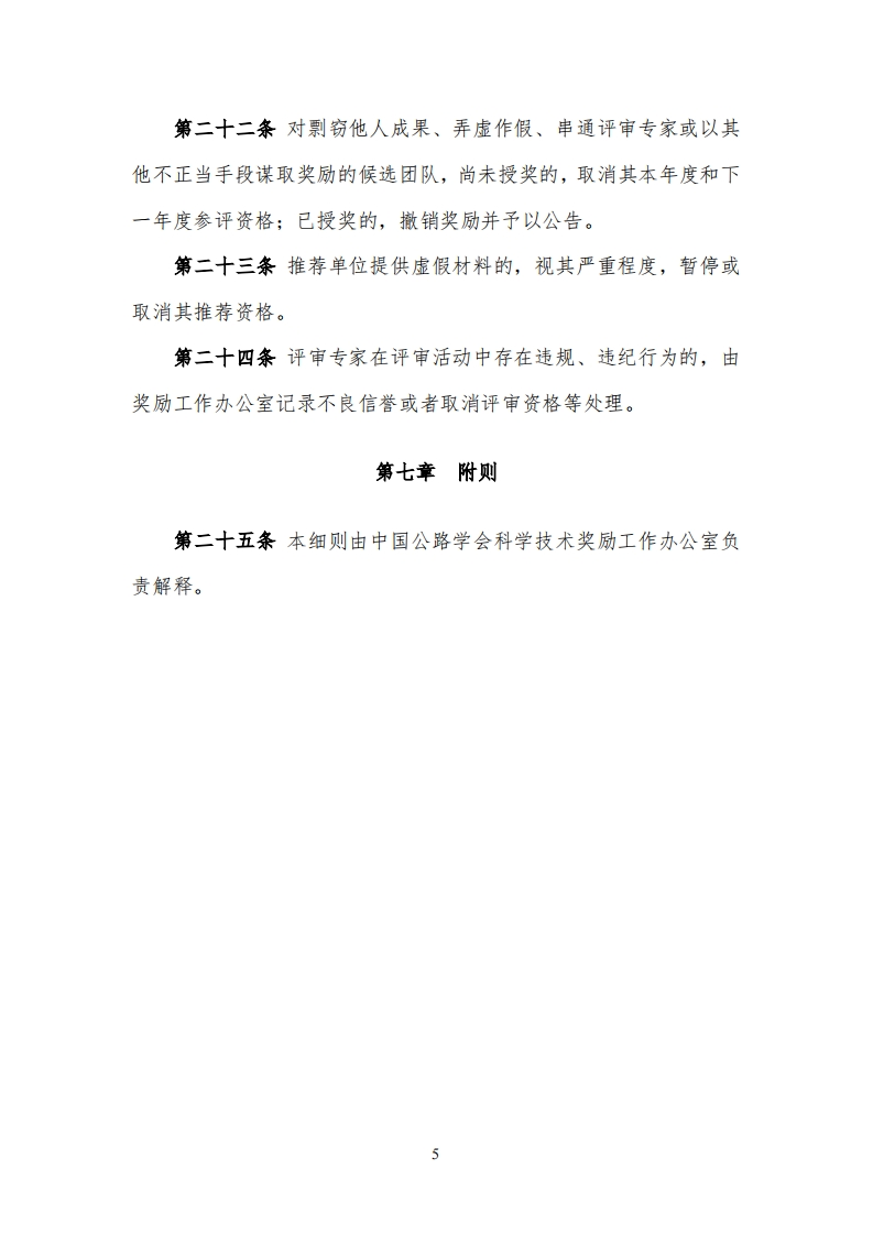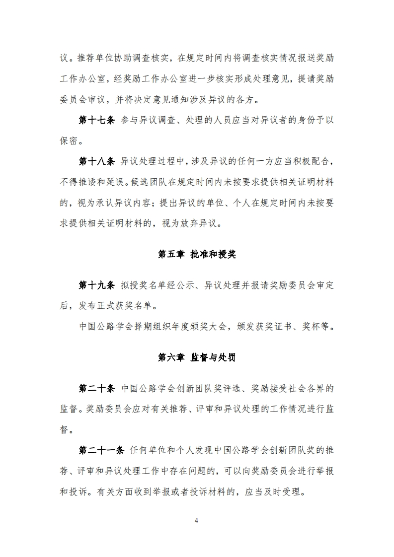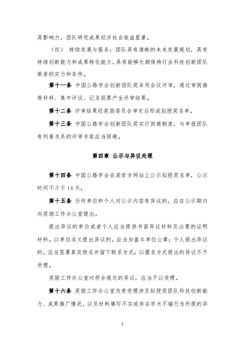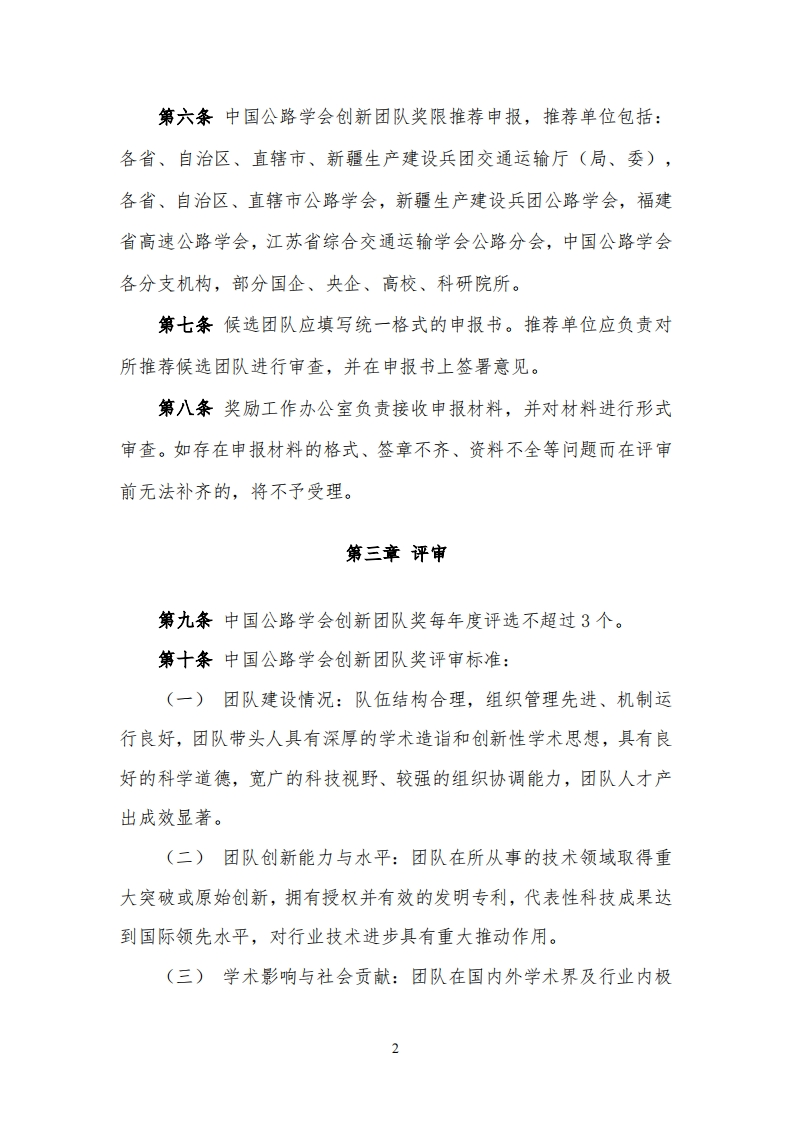 中国公路学会科学技术奖励办法创新团队奖实施细则(试行)第一章总则第一条为做好中国公路学会创新团队奖励工作,保证中国公路学会创新团队奖的评审质量,根据《国家科学技术奖励条例实施细则》《中国公路学会科学技术奖励办法》(以下简称《奖励办法》),制定本细则。第二条本细则适用于中国公路学会创新团队奖的推荐、评审、授奖等各项活动。第二章申报、推荐和受理第三条团队应成立5年以上,符合行业发展战略和未来发展需求,具有共同的目标、稳定的基础、鲜明的特色;第四条团队带头人应具有正高级专业技术职称且不超过3人,团队主要成员不超过15人;第五条团队依托相关科研平台,有长期持续合作基础。依托的科研平台范围包括但不限于:全国(国家)重点实验室、国家工程技术研究中心、国家工程研究中心、国家工程实验室及交通运输行业研发中心、交通运输行业重点实验室、省重点实验室和市重点实验室、企业重点实验室。1