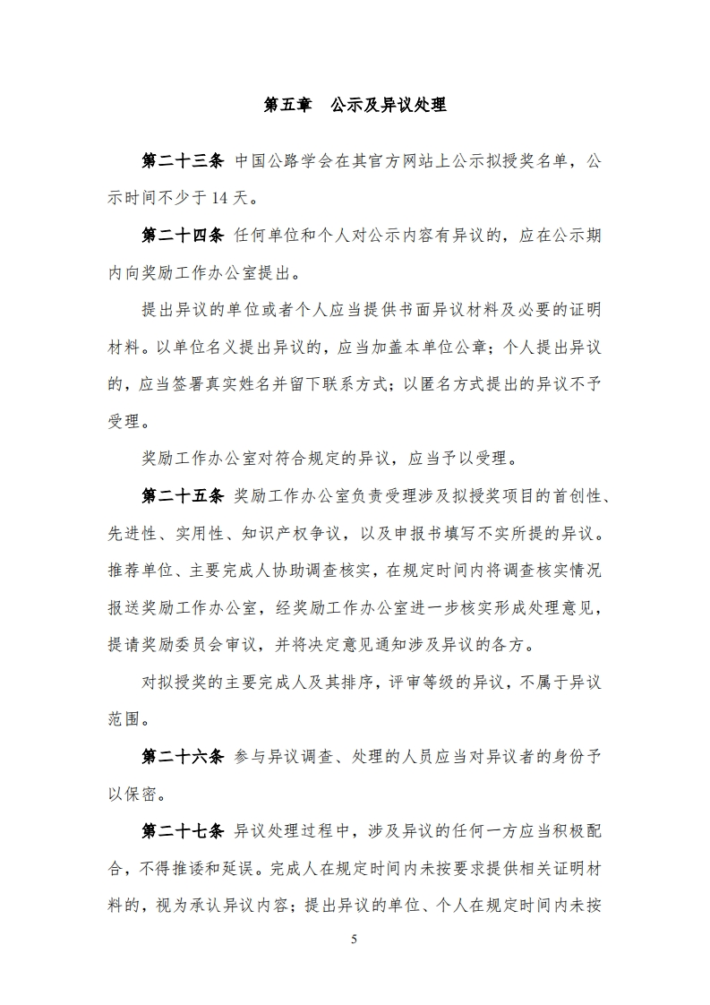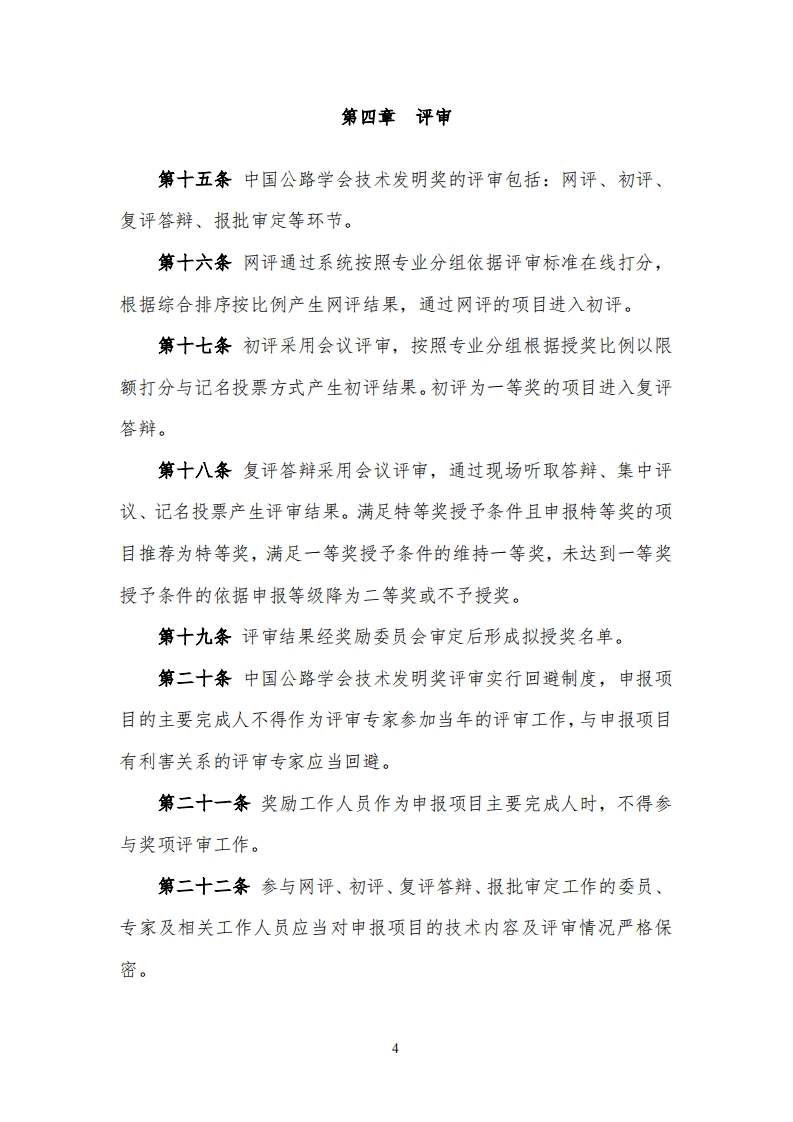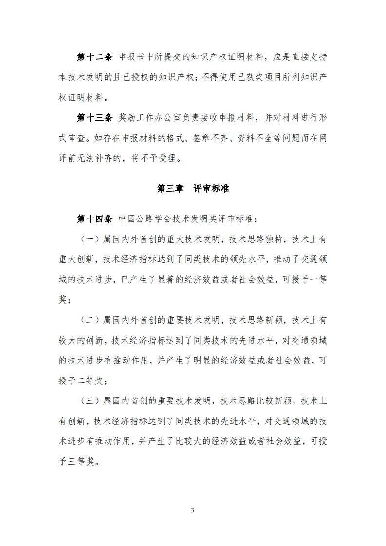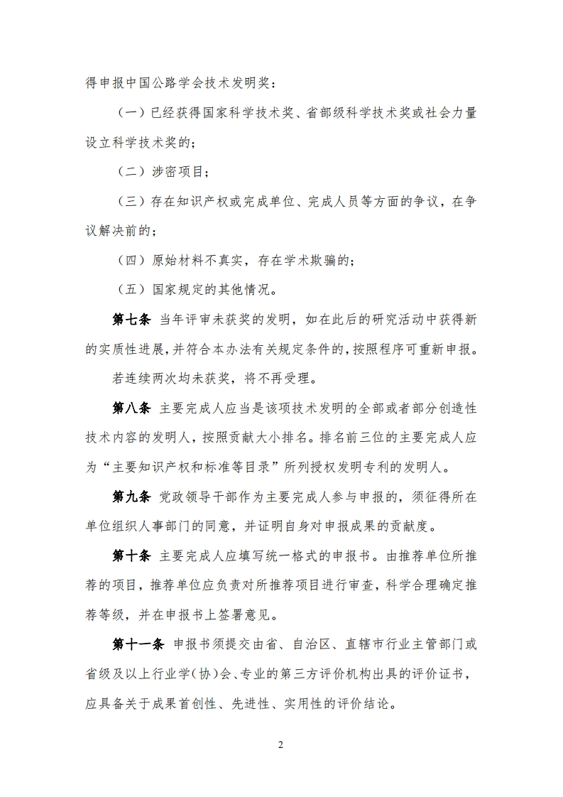 中国公路学会科学技术奖励办法技术发明奖实施细则(试行)第一章总则第一条为做好中国公路学会技术发明奖励工作,保证中国公路学会技术发明奖的评审质量,根据《国家科学技术奖励条例实施细则》《中国公路学会科学技术奖励办法》(以下简称《奖励办法》),制定本细则。第二条本细则适用于中国公路学会技术发明奖的推荐(申报)、评审、授奖等各项活动。第二章申报和受理第三条中国公路学会技术发明奖申报包括推荐申报和直接申报两种形式。第四条推荐单位包括:各省、自治区、直辖市、新疆生产建设兵团交通运输厅(局、委),各省、自治区、直辖市公路学会,新疆生产建设兵团公路学会,福建省高速公路学会,江苏省综合交通运输学会公路分会,中国公路学会各分支机构,部分国企、央企、高校、科研院所。第五条无推荐单位的可直接申报。第六条项目成果须经过两年以上实施应用,有以下情况的,不