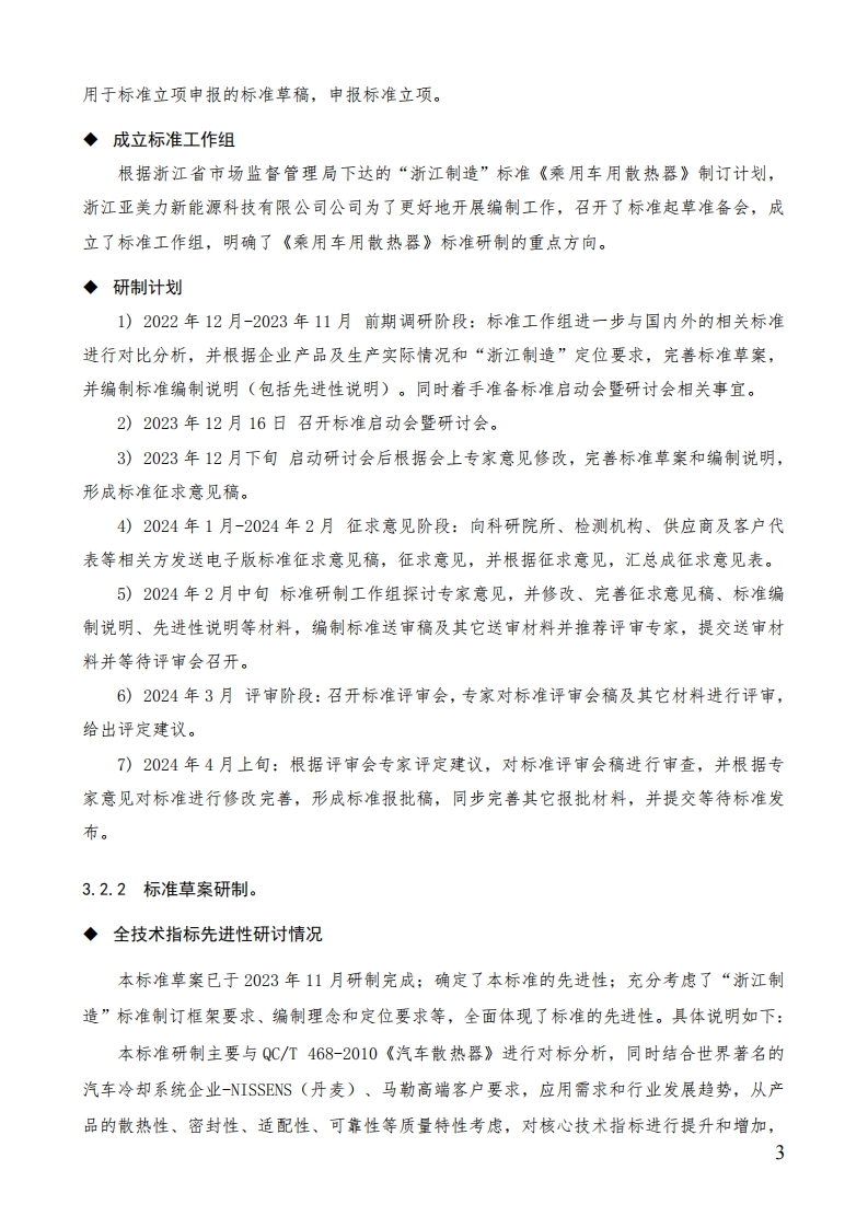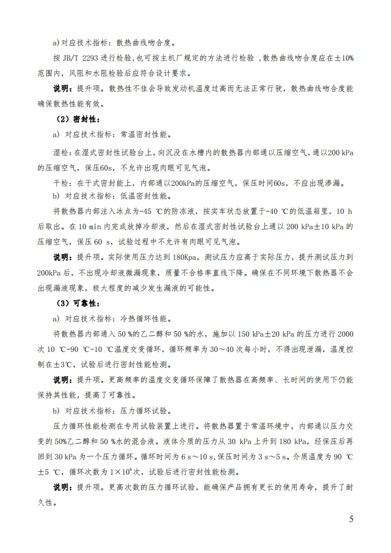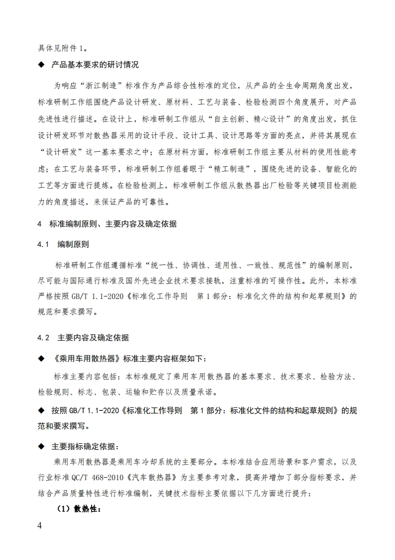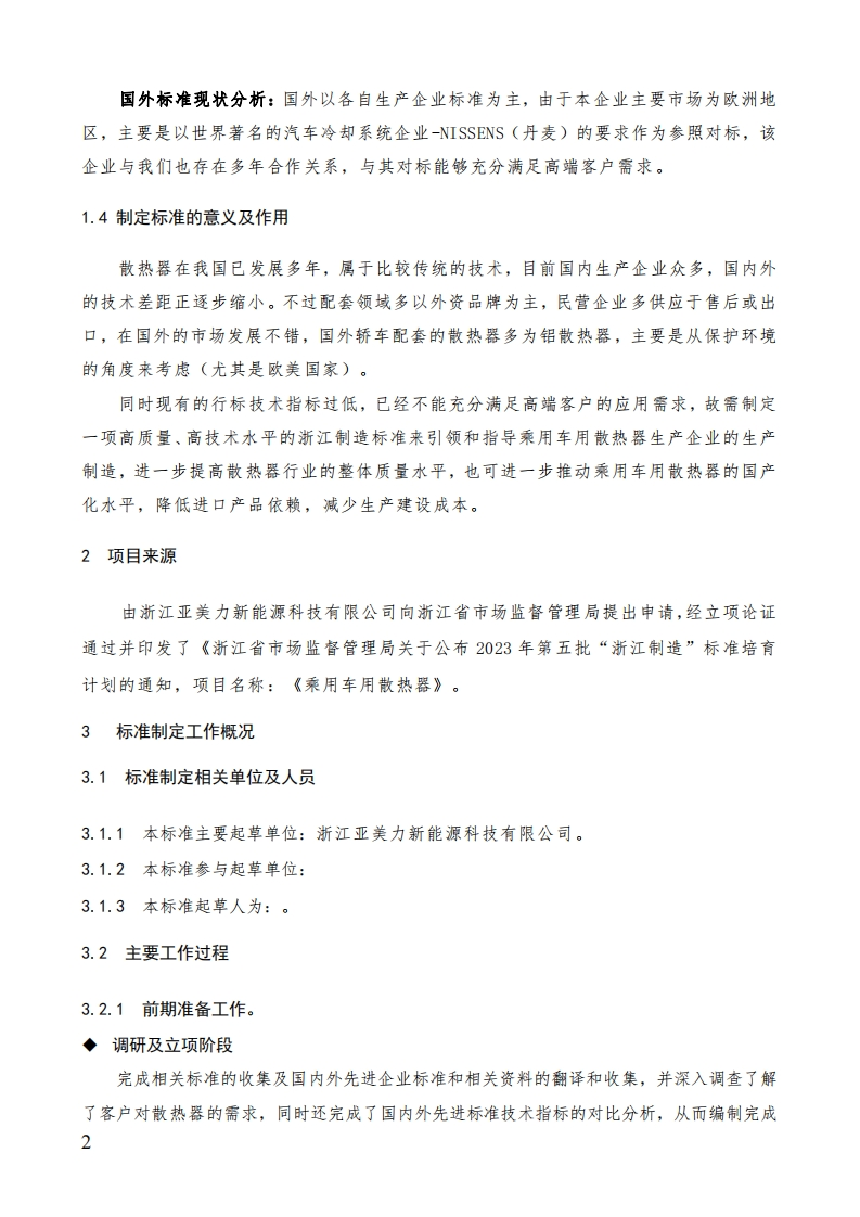 《乘用车用散热器》“浙江制造”标准编制说明(征求意见稿)1项目背景1.1产品用途乘用车用散热器(以下筒称“散热器”)的作用是将发动机水套内冷却液所携带的多余热量,借助外界强制气流的作用散发到空气中的热交换装置。保证发动机能始终处于适宜的温度状态下工作,以获得较高的发动机经济性能、动力性能、工作可靠性。若散热器散热能力不足,会使发动机过热,润滑油变稀,致使润滑油泄漏及缸体与活塞直接接触而拉缸,甚至发动机烧损。若散热器换热富余量过大,会使发动机在较低温度下工作,不能发挥最大的功率并增加油耗。因此,散热器是乘用车冷却系统的主要部分,目的是保护发动机避免因过热造成的破坏,使发动机处于适当的温度范围内。1.2市场前景从散热器应用领域及作用来说,散热器是汽车中重要零部件之一,因此汽车的生产量和保有量决定了散热器产品的市场容量。从汽车生产量来看:全球汽车产量达到8.5亿辆,我国汽车产量为2.5亿辆,其中乘用车产量占比为77.26%。从汽车保有量来看:随着中国经济水平的不断提升,中国乘用车保有量一直处于上升的状态。2012年中国乘用车保有量为1.21亿辆,2021年中国乘用车保有量增长至3.15亿辆。乘用车产业历经百年发展,已成为世界上规模最大、最重要的产业之一,是美国、中国、日本、德国等众多工业发达国家的国民经济支柱产业,乘用车的发展势必带动散热器的发展。1.3产品标准发展现状国内标准现状分析:乘用车用散热器现行国内标准为QC/T468-2010《汽车散热器》,通过企业标准信息公共服务平台查询,国内同行企业执行标准公开执行的也是以该标准为主。1