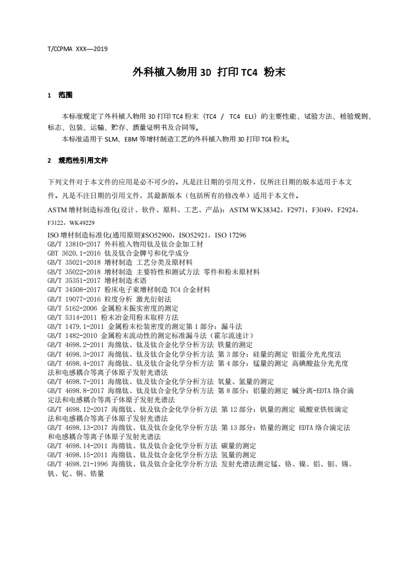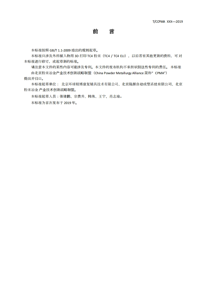 (7)外科植入物用3D打印TC4粉末()348072@abc5天前发布关注私信0.59MB11页04410(7)外科植入物用3D打印TC4粉末()此内容为付费资源,请付费后查看¥17¥19黄金会员免费钻石会员免费立即购买您当前未登录!建议登陆后购买,可保存购买订单付费资源 第1页 / 共11页 第2页 / 共11页 第3页 / 共11页 第4页 / 共11页 第5页 / 共11页 试读已结束,还剩6页,您可下载完整版后进行离线阅读 © 版权声明文章版权归作者所有,未经允许请勿转载。THE END标准规范 文本预览 ICS77.150H64北京粉末冶金产业技术创新战略联盟团体标准T/CCPMA XXX-2019外科植人物用3D打印TC4粉末3D printing TC4 powder for Surgical implants(征求意见稿)2019-XX-XX发布2019-XX-XX实施北京粉末冶金产业技术创新战略联盟发布 查看更多 收起部分 喜欢就支持一下吧点赞10 分享QQ空间微博QQ好友海报分享复制链接收藏