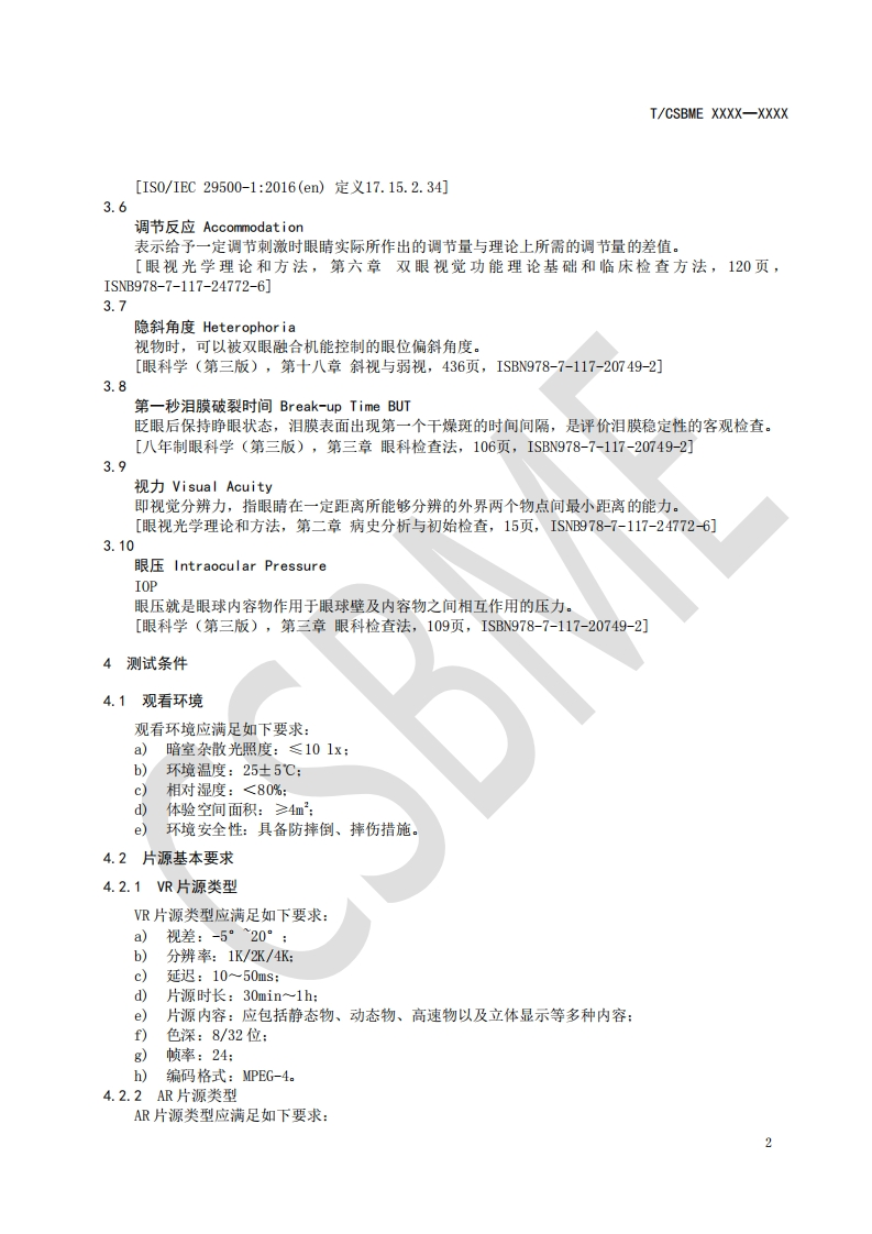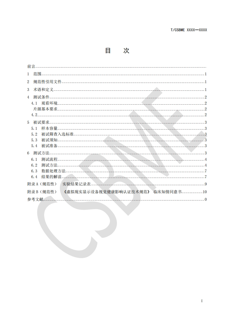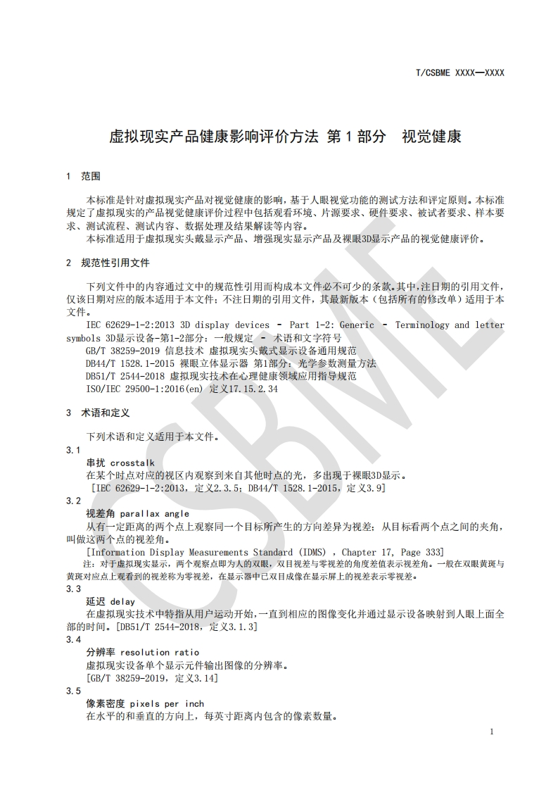 ICS点击此处添加ICS号CCS点击此处添加cCS号团体标准T/CSBME XXXX-XXXX虚拟现实产品健康影响评价方法第1部分视觉健康Virtual reality product health impact assessment method Part 1 Visual health(征求意见稿)在提交反馈意见时,请将您知道的相关专利连同支持性文件一并附上。XXXX-Xx-XX发布XXXX-Xx-XX实施中国生物医学工程学会发布